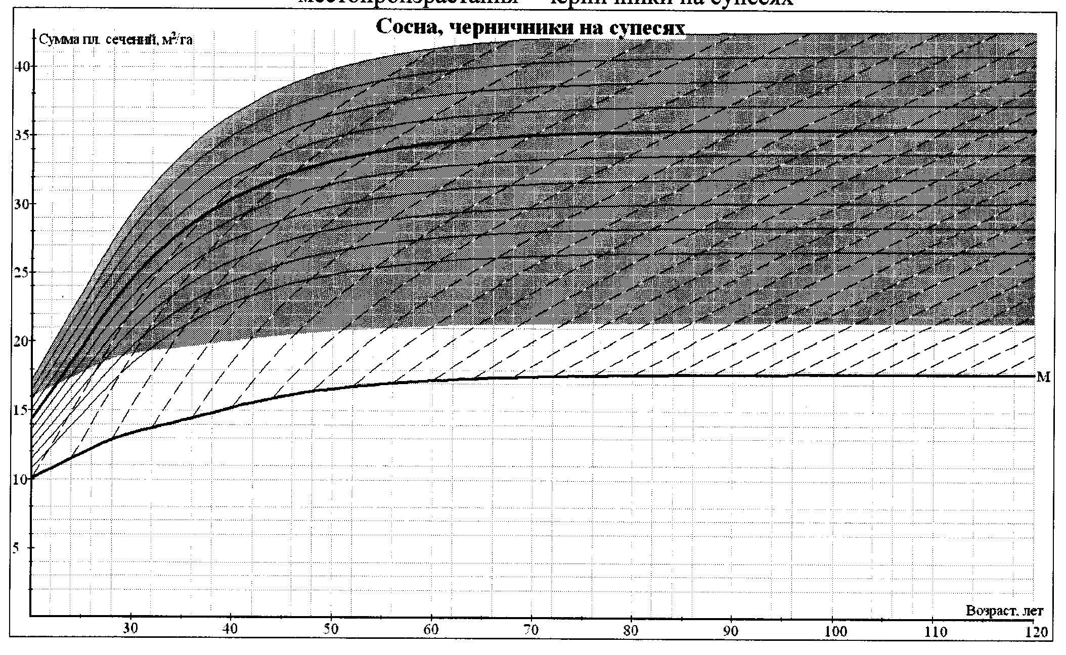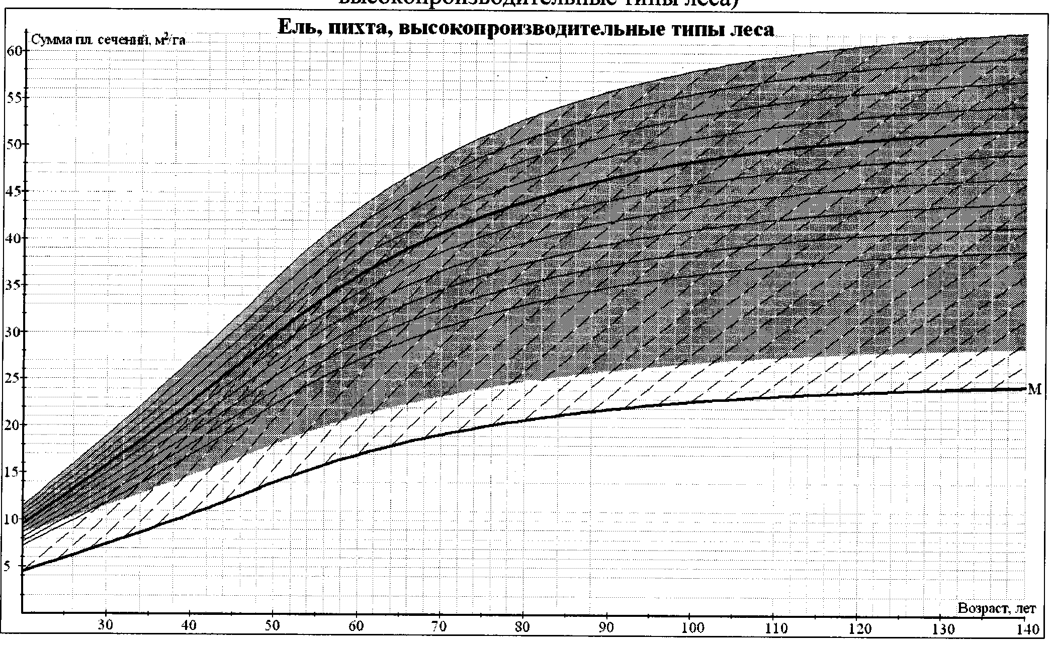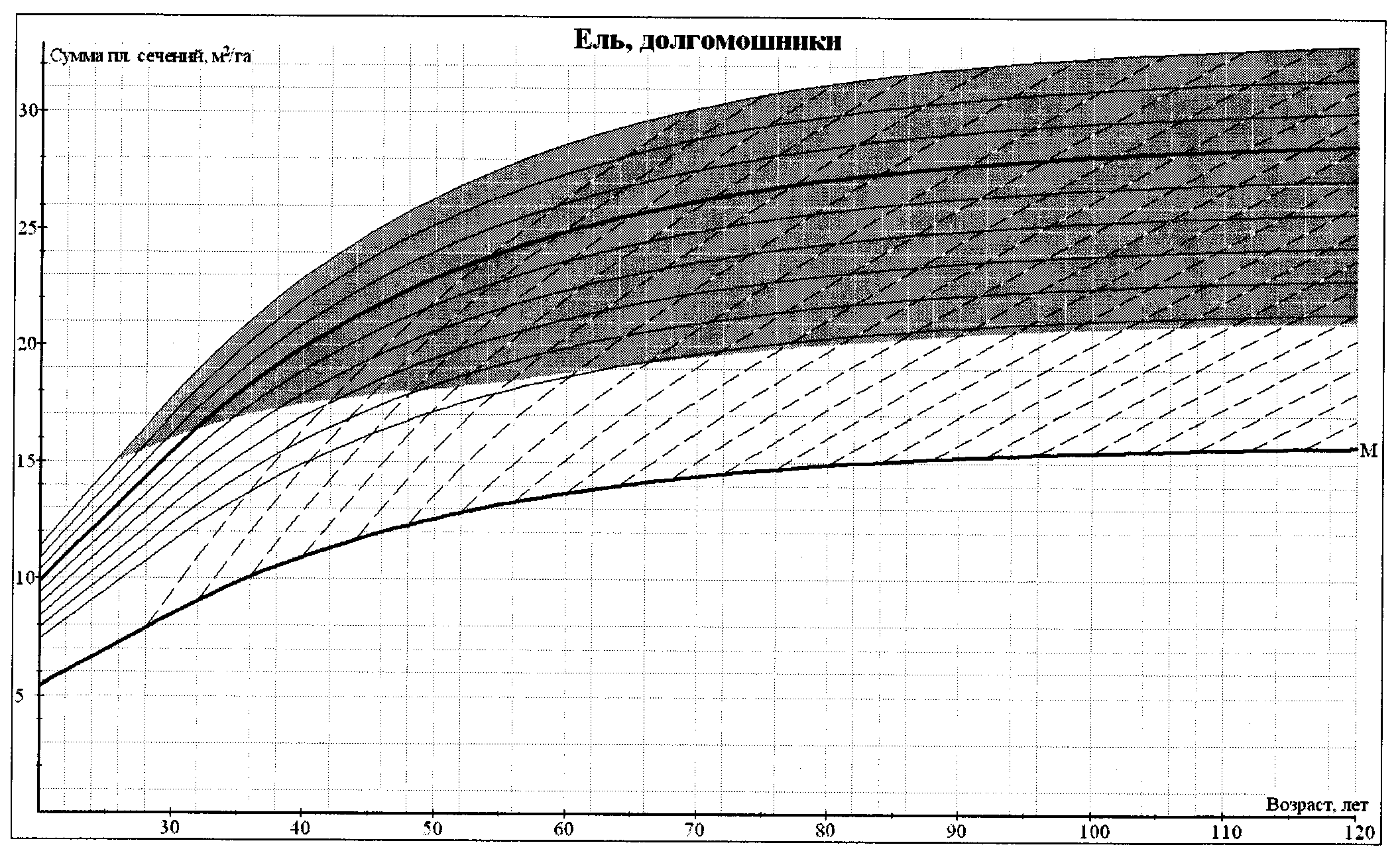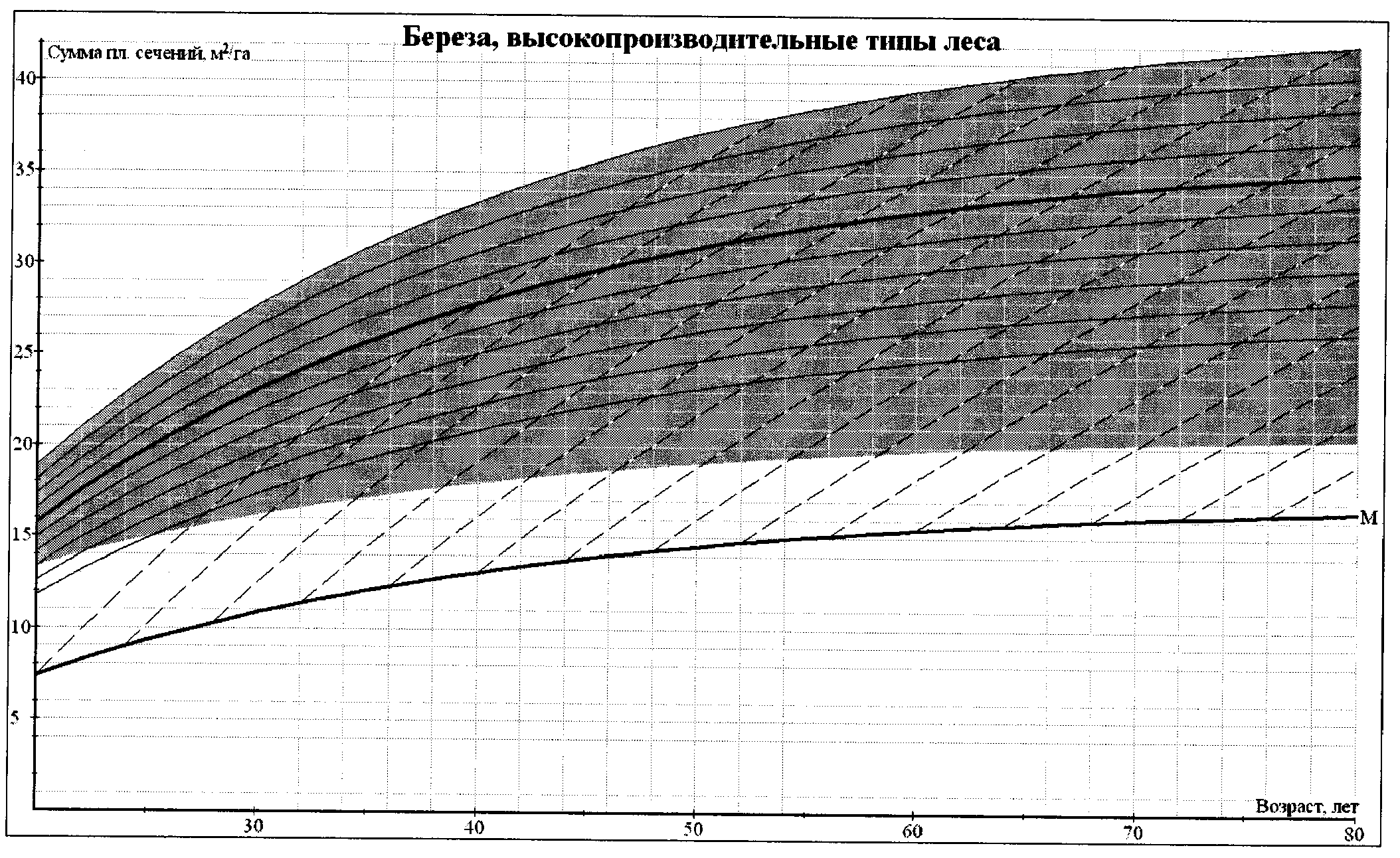 Нижняя сплошная толстая линия, обозначенная буквой М, указывает минимально допустимую абсолютную полноту древостоя после изреживания. Изреживание до этой полноты обеспечивает максимальный прирост древостоя. На основе минимально допустимого значения абсолютной полноты проводится контроль изреживания по абсолютной полноте.