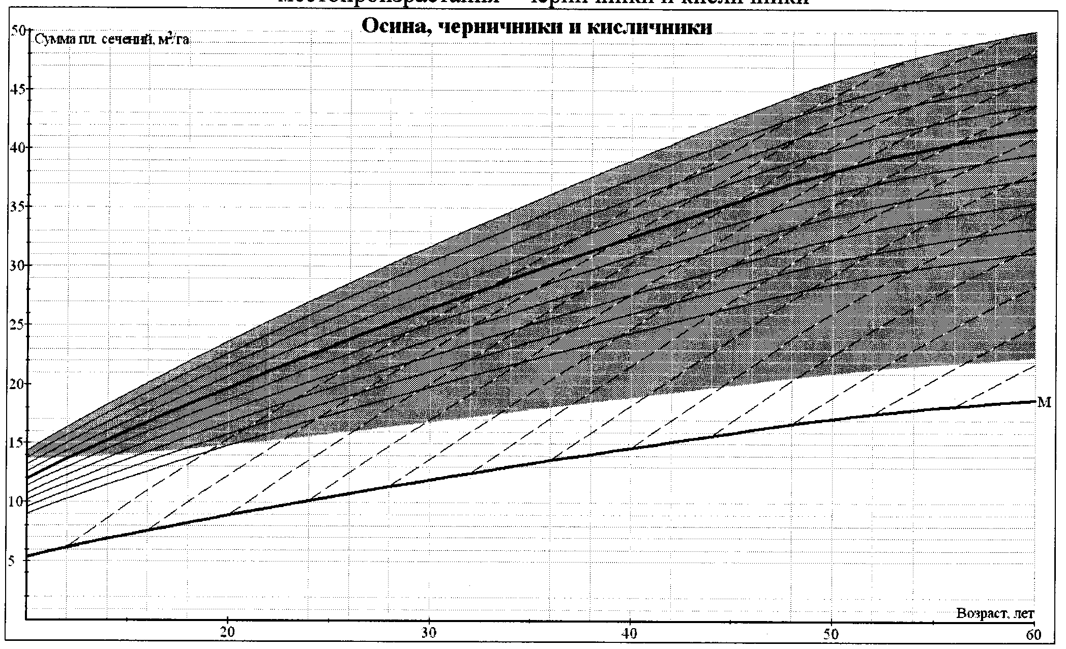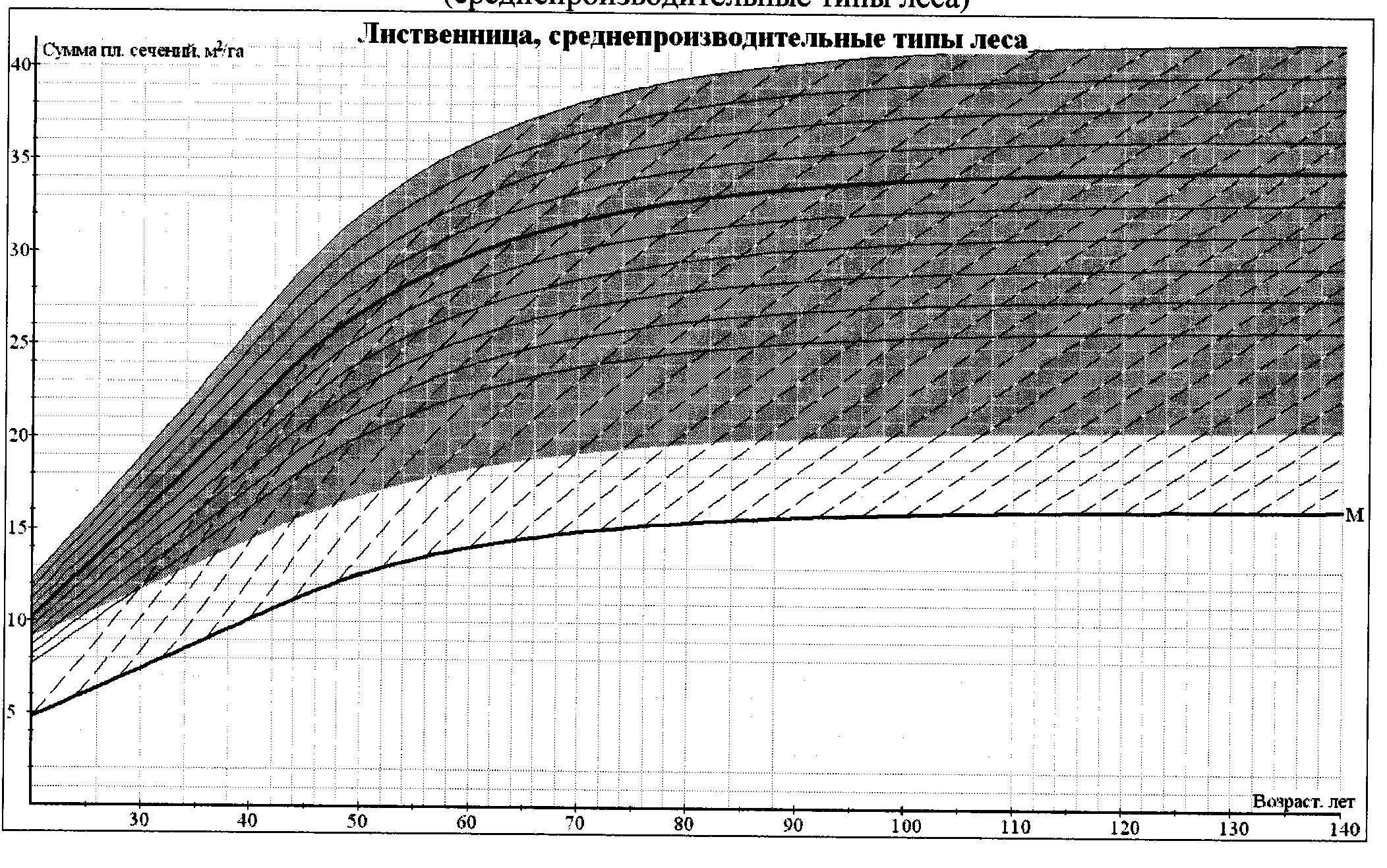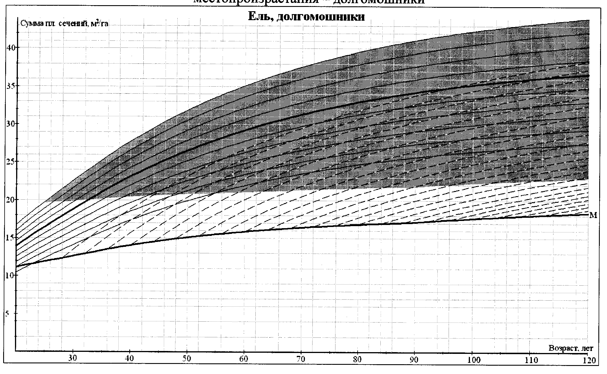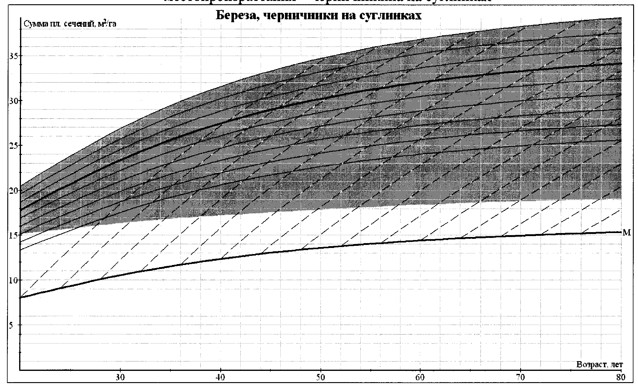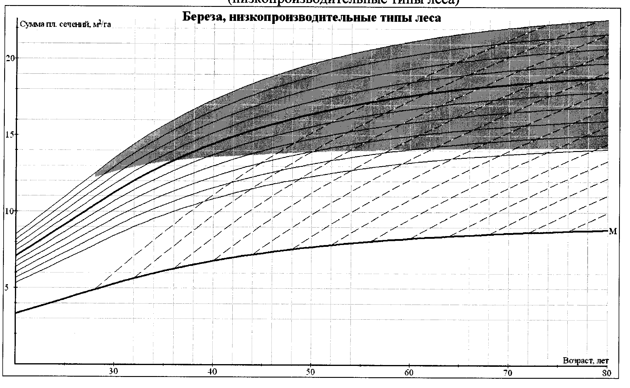 Нижняя сплошная толстая линия, обозначенная буквой М, указывает минимально допустимую абсолютную полноту древостоя после изреживания. Изреживание до этой полноты обеспечивает максимальный прирост древостоя. На основе минимально допустимого значения абсолютной полноты проводится контроль изреживания по абсолютной полноте.