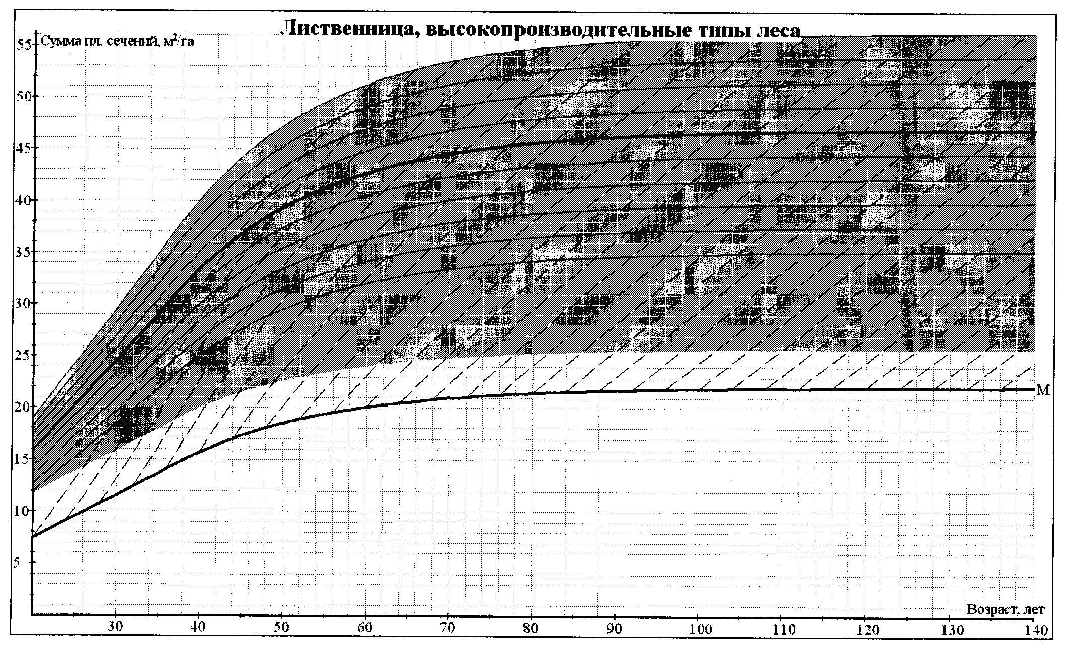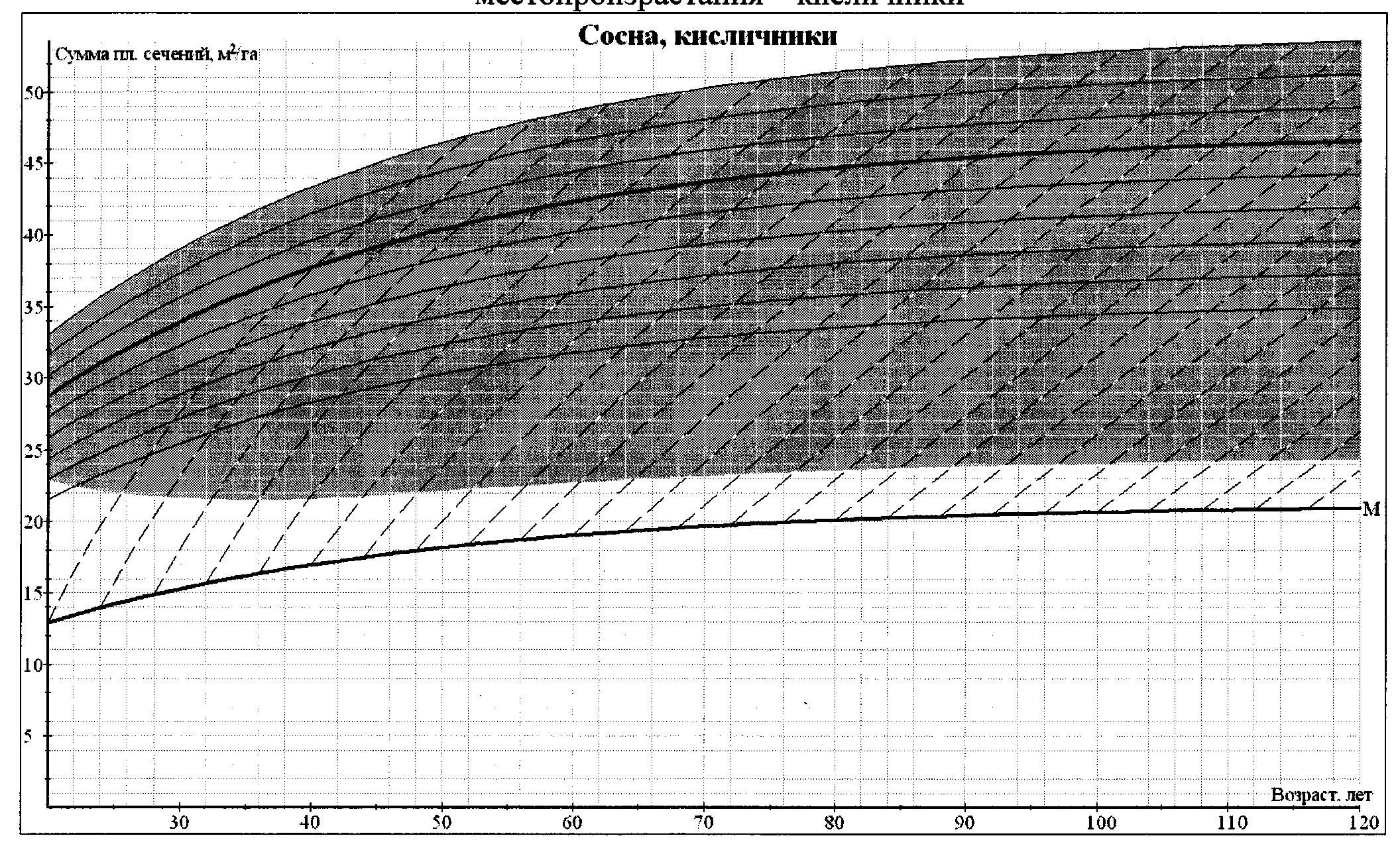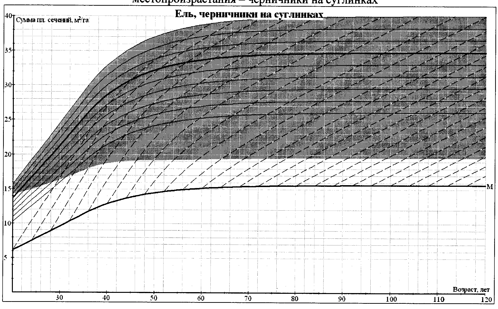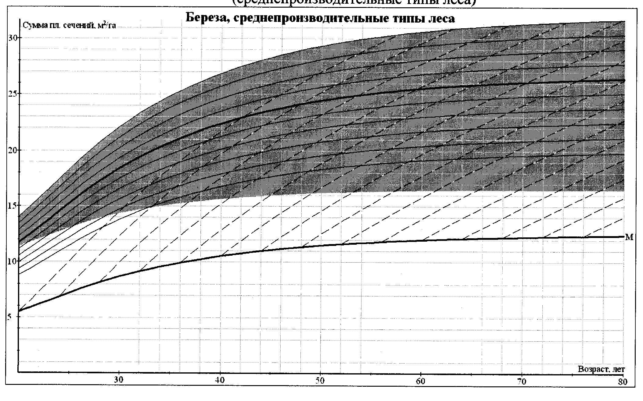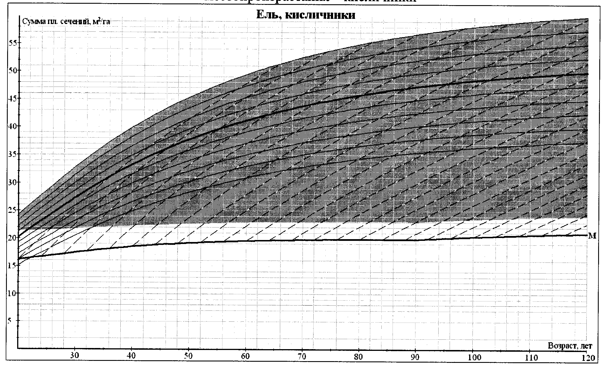 Нижняя сплошная толстая линия, обозначенная буквой М, указывает минимально допустимую абсолютную полноту древостоя после изреживания. Изреживание до этой полноты обеспечивает максимальный прирост древостоя. На основе минимально допустимого значения абсолютной полноты проводится контроль изреживания по абсолютной полноте.