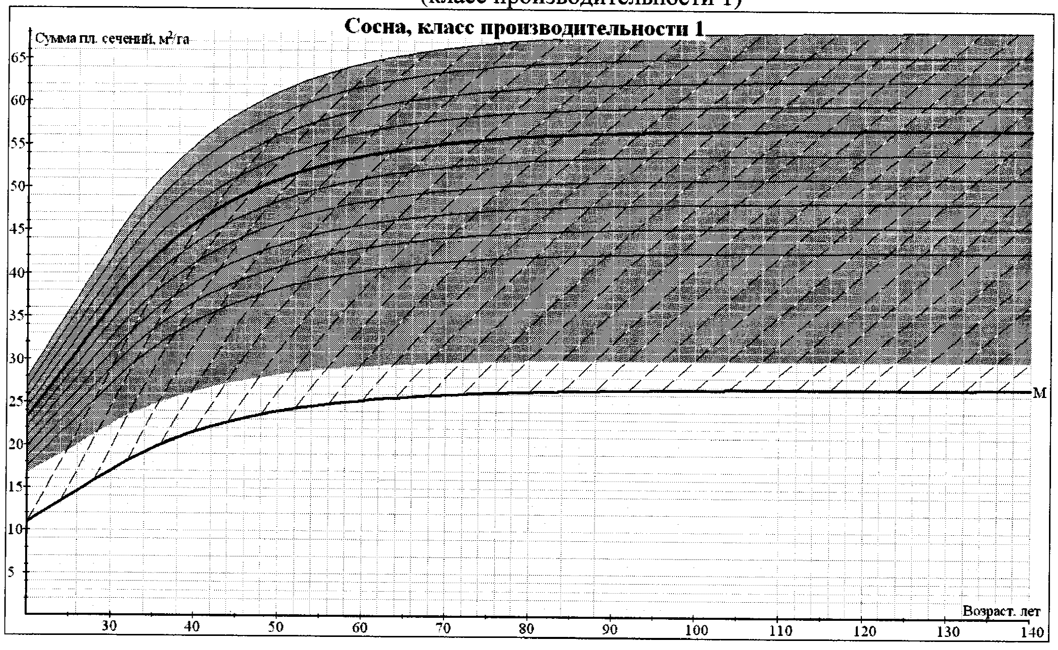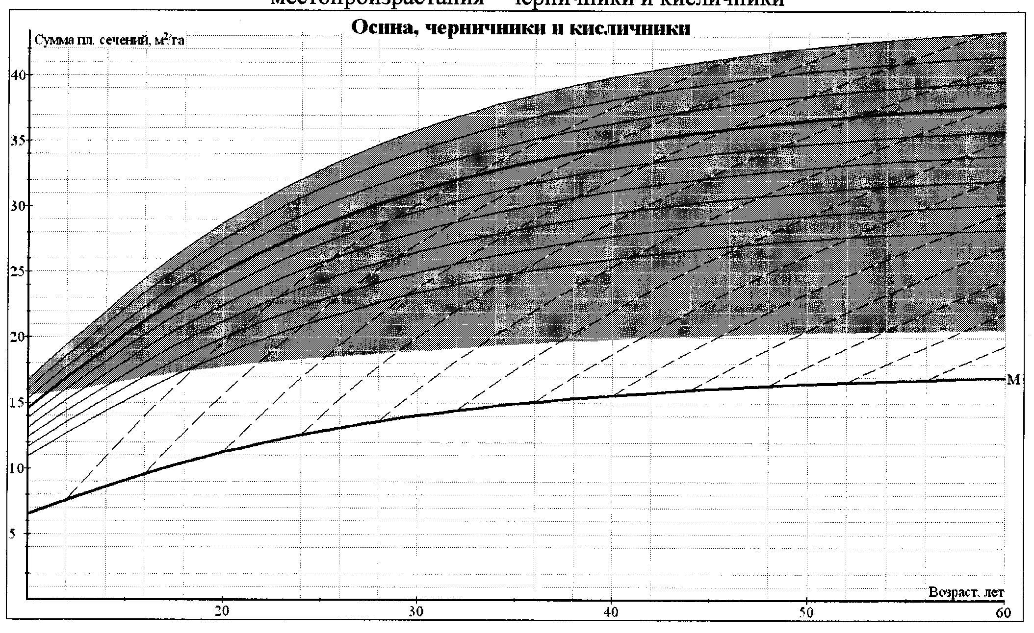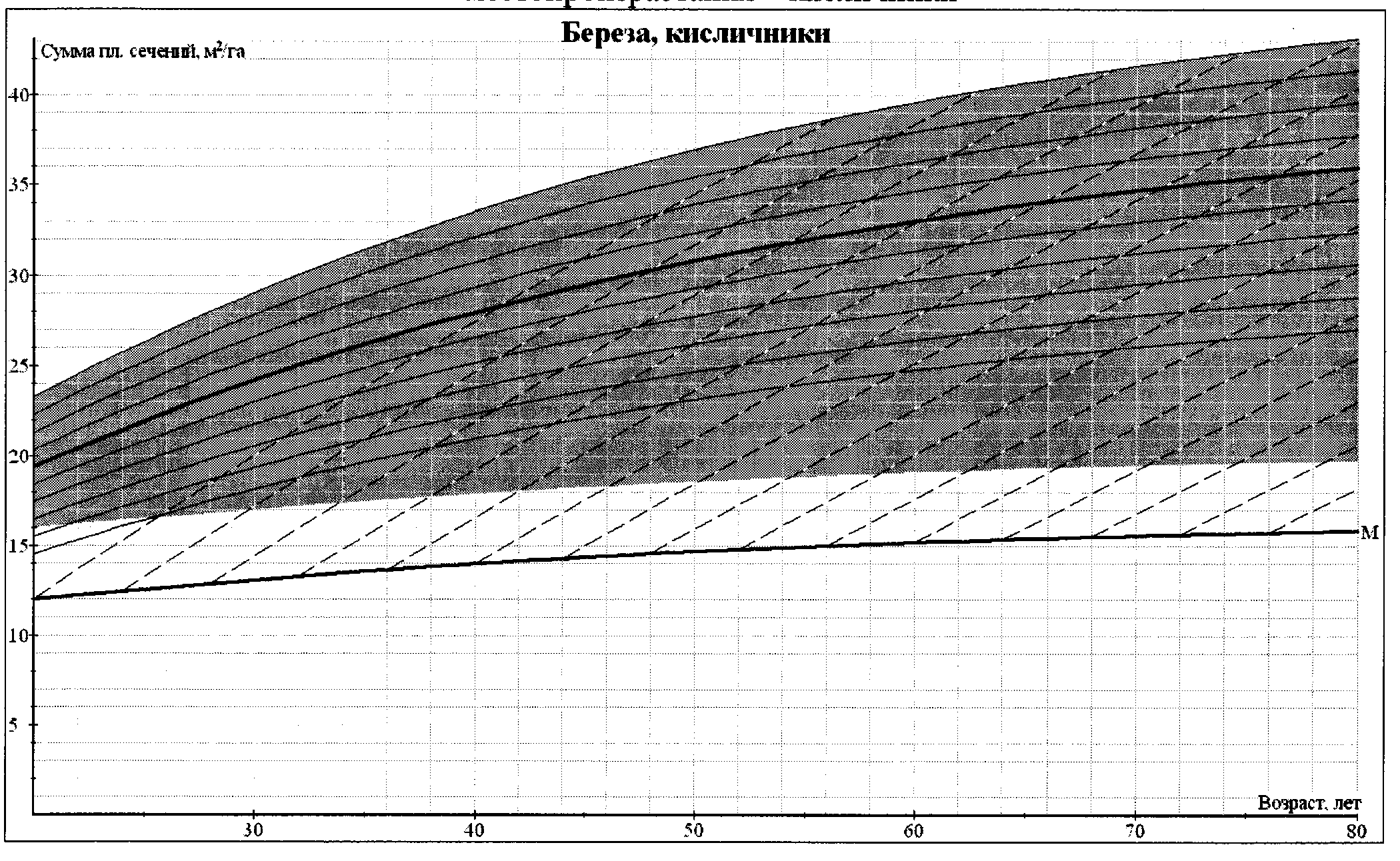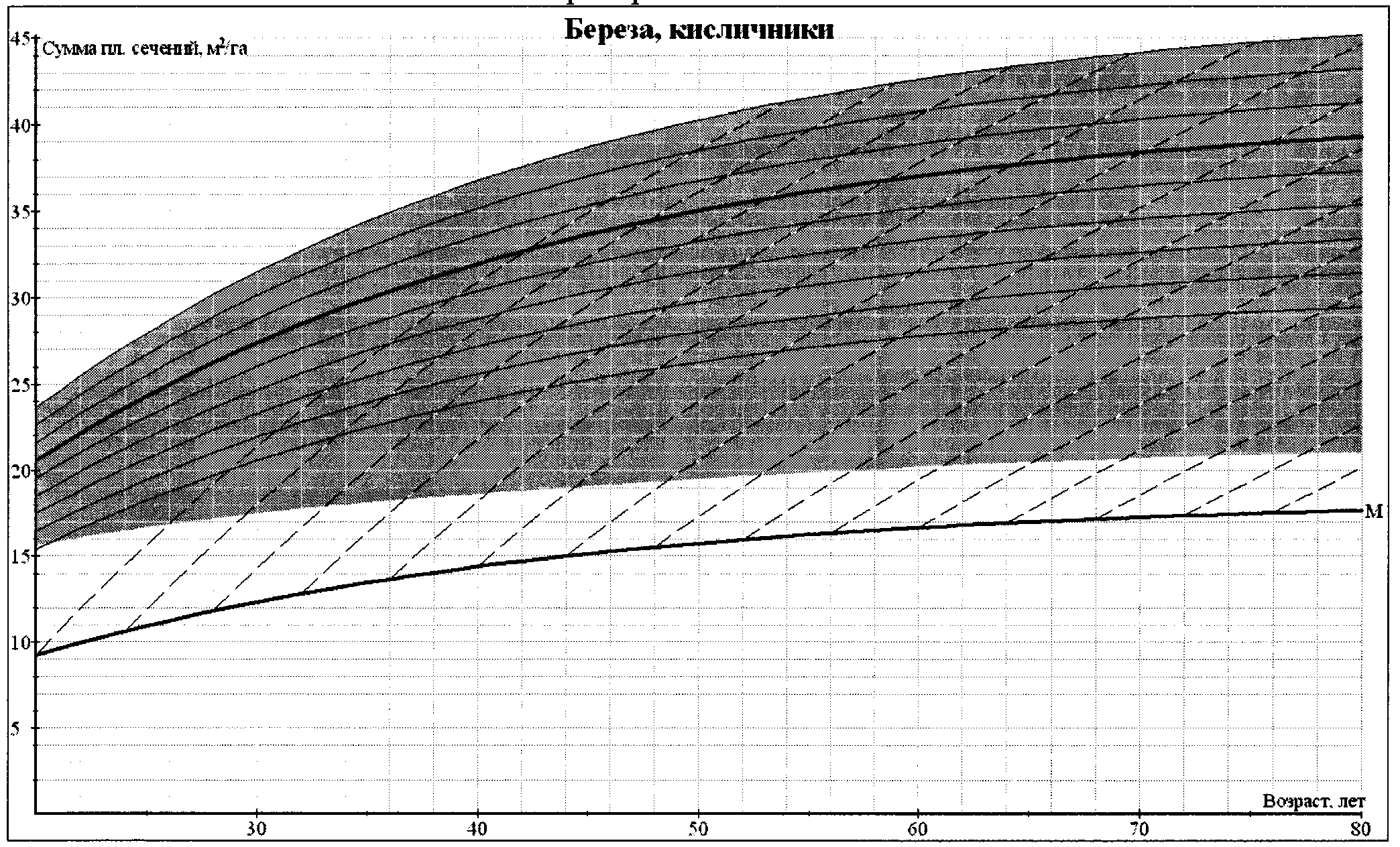 Нижняя сплошная толстая линия, обозначенная буквой М, указывает минимально допустимую абсолютную полноту древостоя после изреживания. Изреживание до этой полноты обеспечивает максимальный прирост древостоя. На основе минимально допустимого значения абсолютной полноты проводится контроль изреживания по абсолютной полноте.