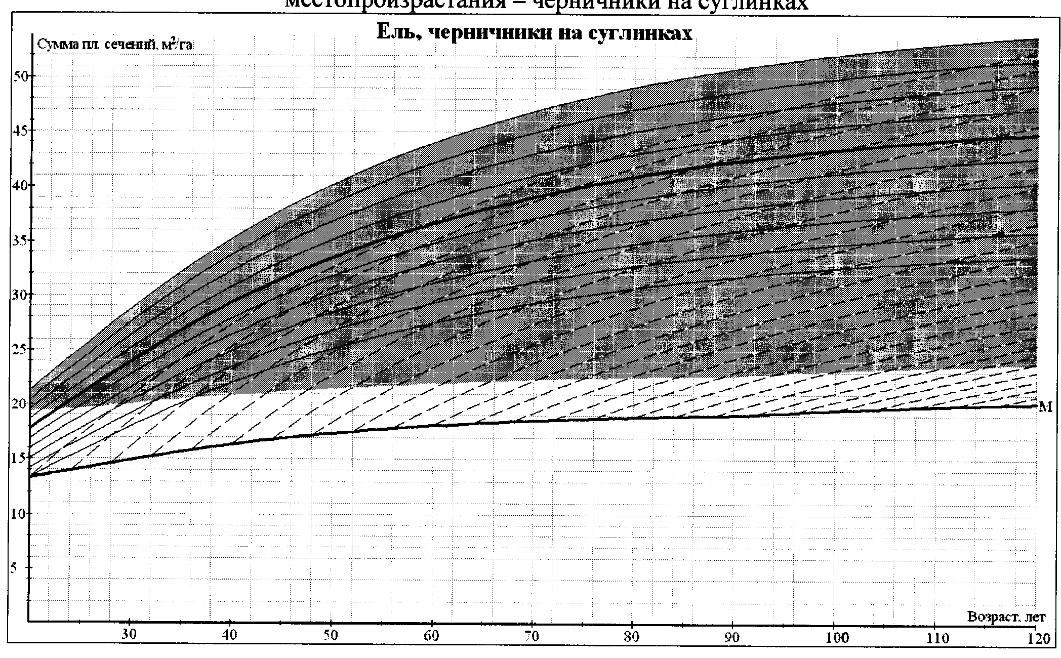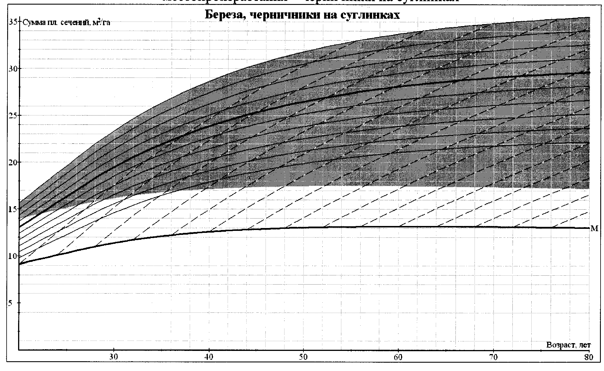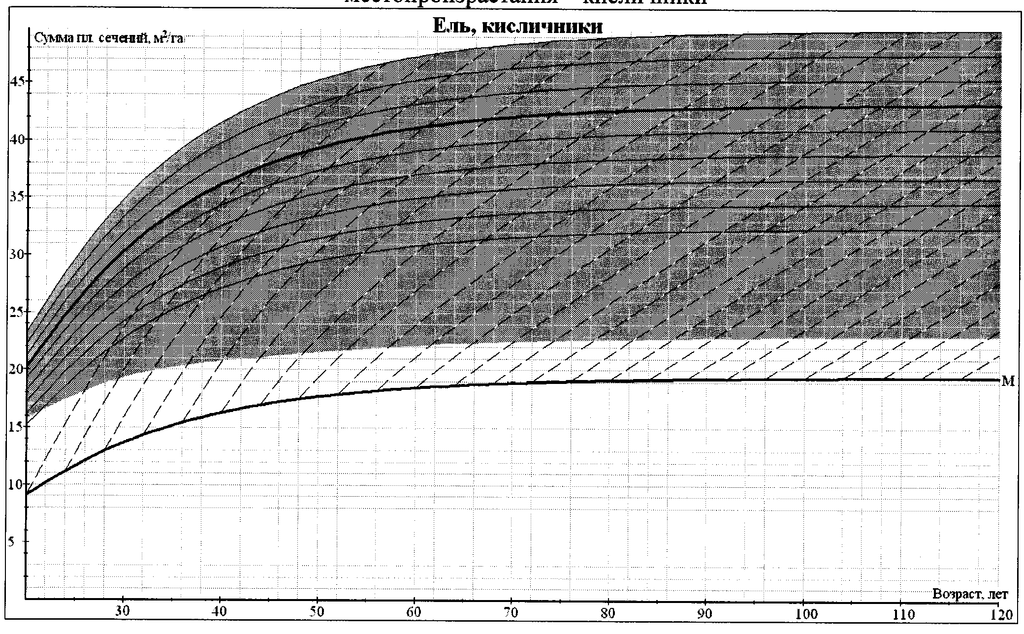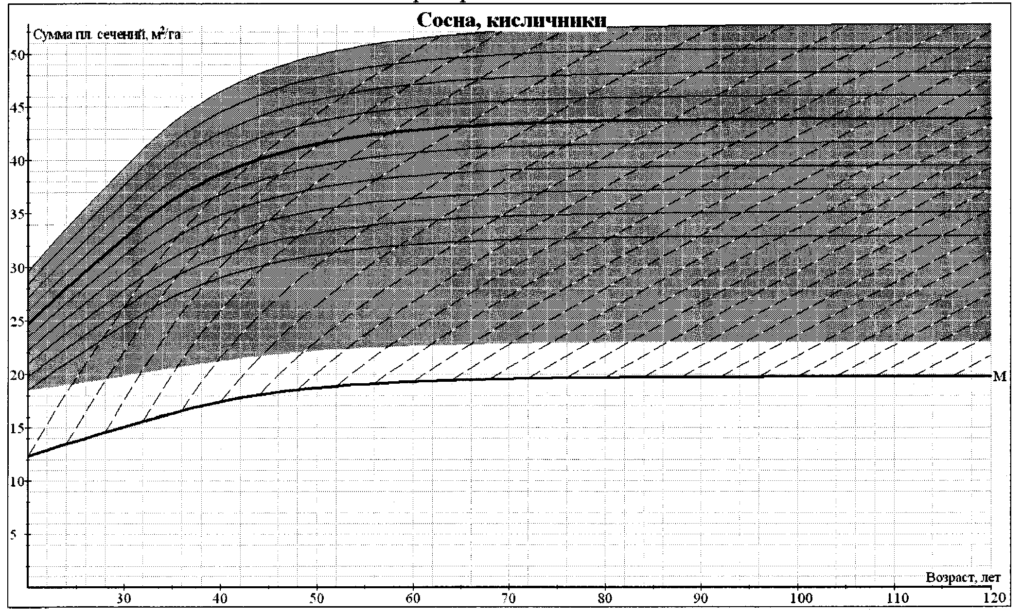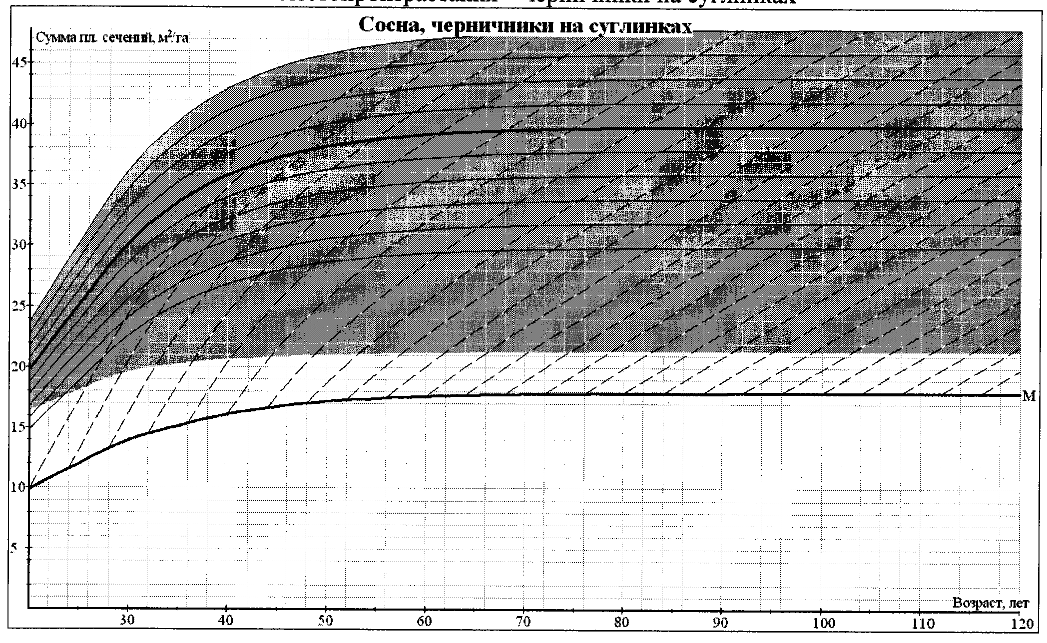 Нижняя сплошная толстая линия, обозначенная буквой М, указывает минимально допустимую абсолютную полноту древостоя после изреживания. Изреживание до этой полноты обеспечивает максимальный прирост древостоя. На основе минимально допустимого значения абсолютной полноты проводится контроль изреживания по абсолютной полноте.