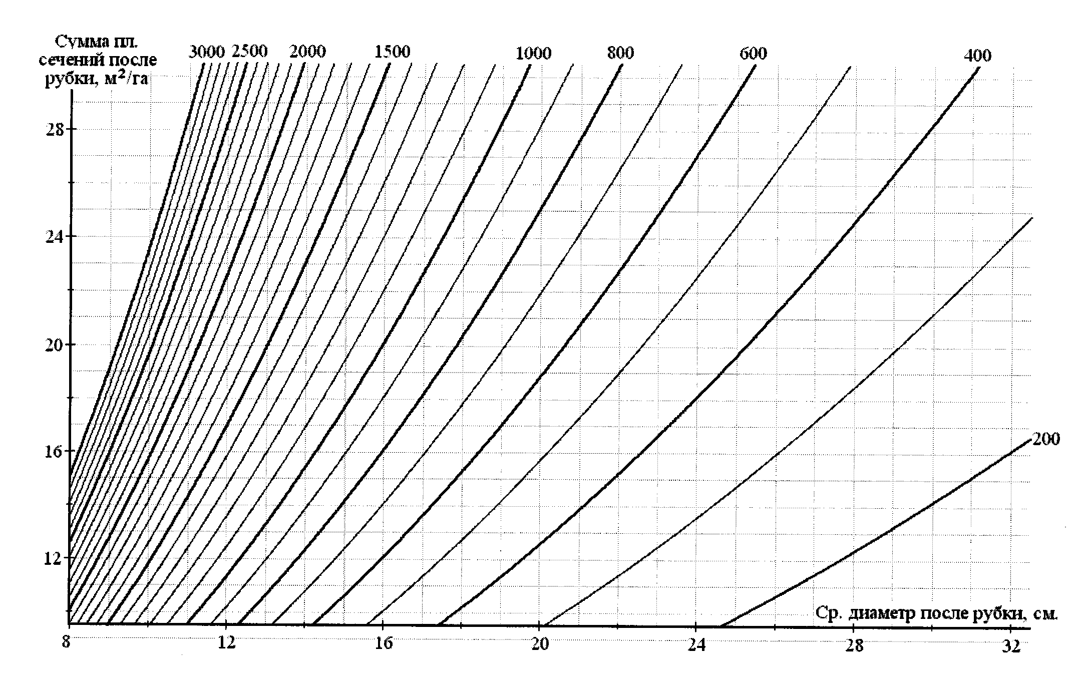 3) Графический норматив для определения числа оставляемых стволов в зависимости от абсолютной полноты и среднего диаметра после рубки.