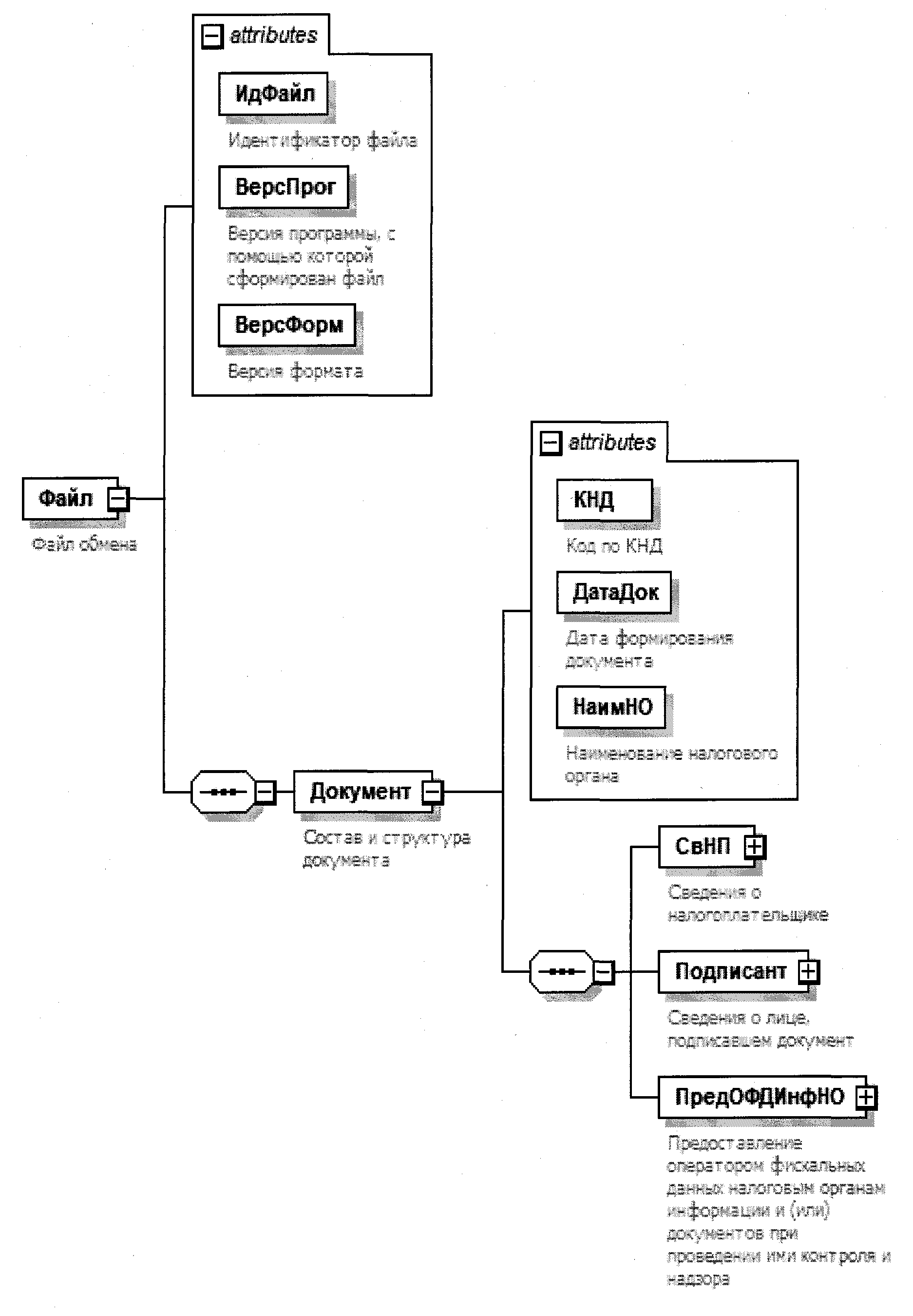 XML схема файла обмена приводится отдельным файлом и размещается на официальном сайте Федеральной налоговой службы.