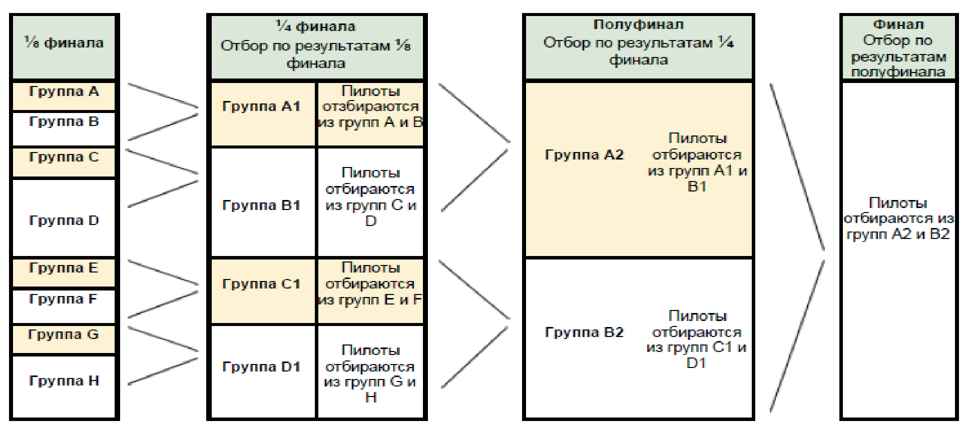 7.21.6.5.1. Из участников, в каждом туре, при помощи жребия в соответствии с используемыми радиоканалами формируются группы, для того чтобы было как можно большее число одновременных полетов. В группе должно быть не менее трех участников. Жеребьевка организуется так, чтобы в группе по возможности не было участников из одной команды. Порядок старта отдельных групп в каждом туре также определяется жребием. Разные составы групп используются для каждого тура.