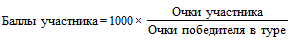 Победитель отдельного полета в каждой группе участников, получает 1000 баллов. Остальные участники группы получают баллы, определяемые по формуле: