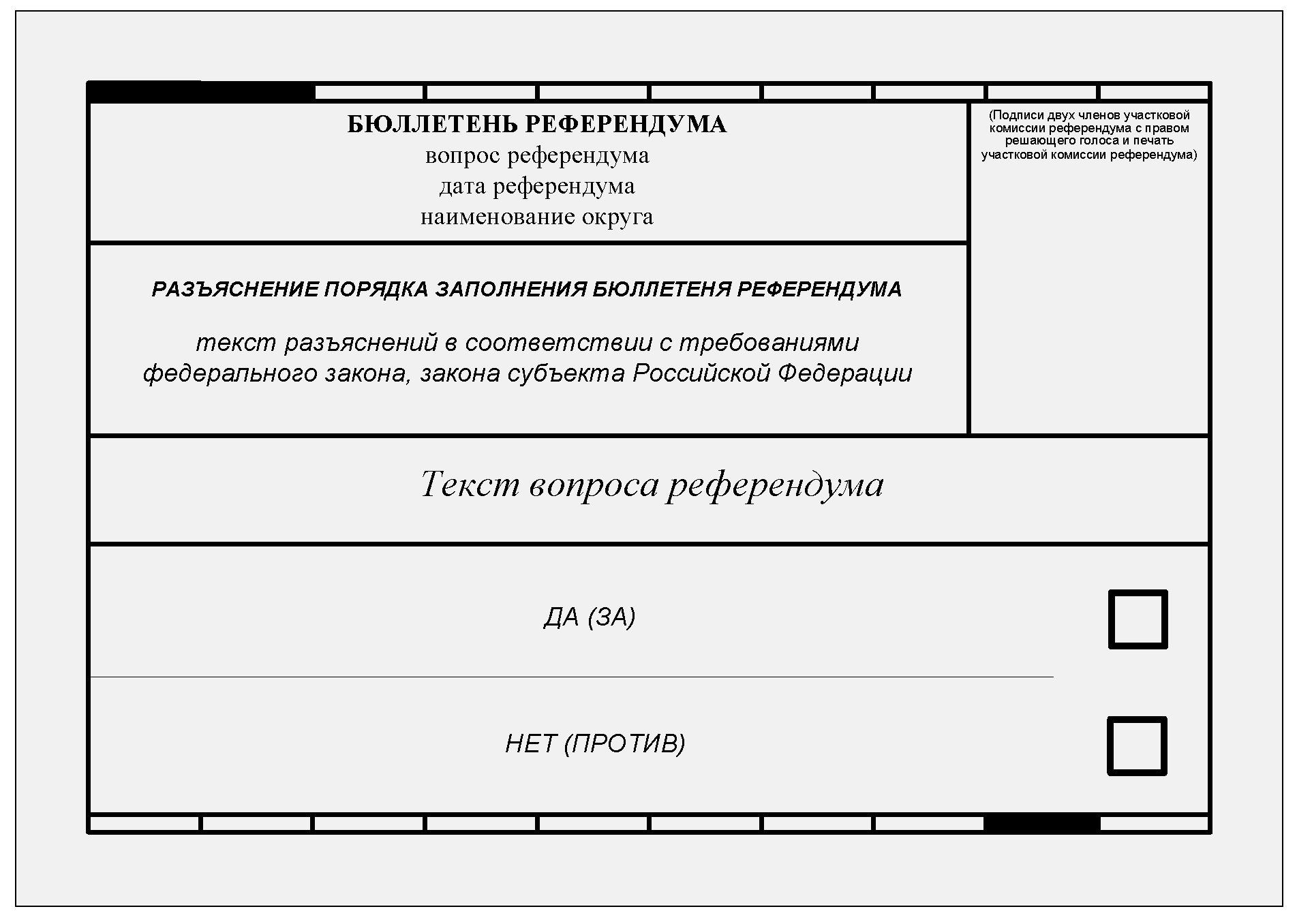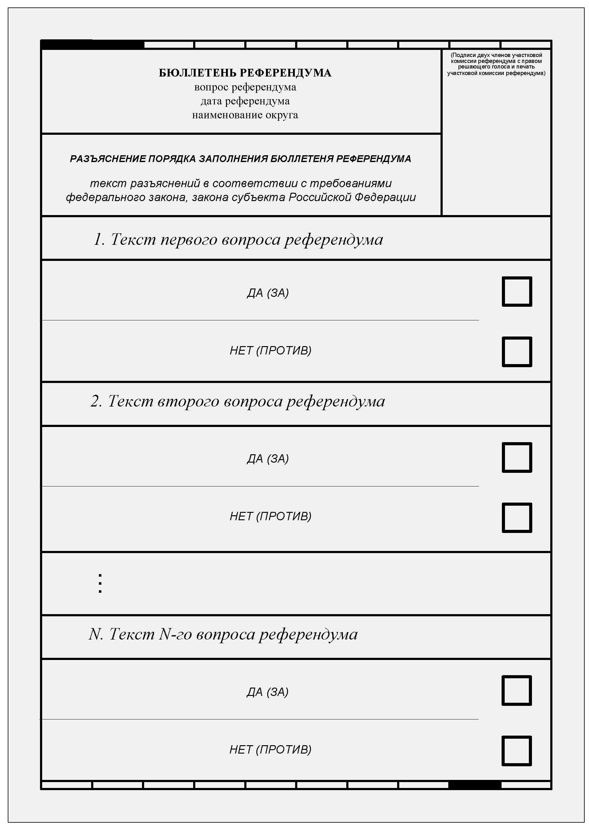 Если прорезь в переносном ящике для голосования меньше ширины бюллетеня, то при проведении досрочного голосования или голосования вне помещения для голосования перед выдачей избирателю, участнику референдума бюллетеня можно предварительно сложить его так, чтобы линия сгиба проходила только между квадратами для отметок избирателя, участника референдума (линию сгиба рекомендуется не фиксировать).