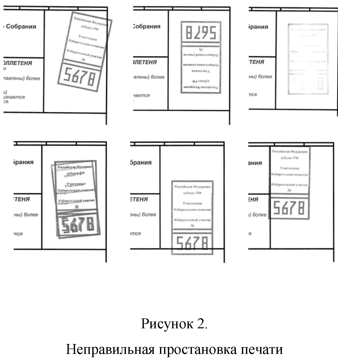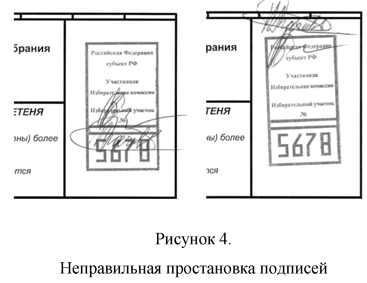 5) если подписи членов участковой комиссии попали в зону цифр на оттиске печати или за границы зоны печати комиссии;