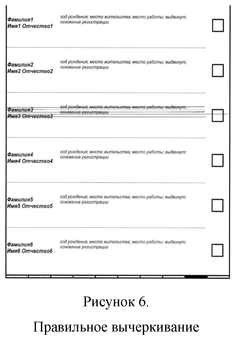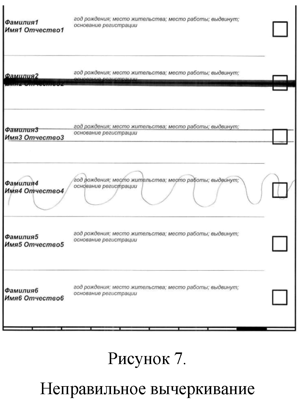 6) при нарушении правил вычеркивания данных выбывших кандидатов, списков кандидатов (если линия вычеркивания данных выбывших кандидатов, списков кандидатов не проходит через квадрат для отметки избирателя, либо пересекает рамку бюллетеня, либо проходит между квадратами, в иных случаях);