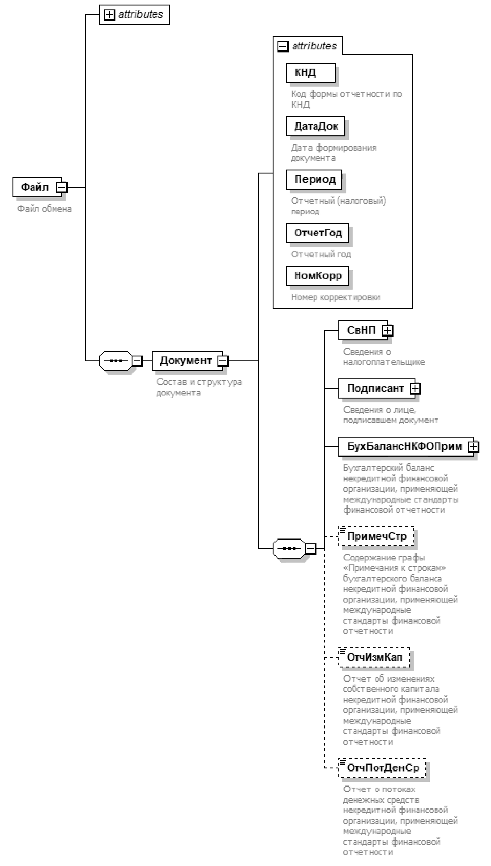 | Отчет о потоках денежных средств некредитной финансовой организации, не применяющей международные стандарты финансовой отчетности | ОтчПотДенСр | П | T(1-255) | Н | Имя файла имеет вид R_Т_A_K_О_N1_GGGGMMDD_N2, где: R_Т - префикс, принимающий значение NO_OPDSNKFO1; A_K - идентификатор получателя информации, где: A - идентификатор получателя, которому направляется файл обмена, K - идентификатор конечного получателя, для которого предназначена информация из данного файла обмена; идентификаторы A и К имеют вид для налоговых органов - четырехразрядный код (код по СОНО); О - идентификатор отправителя информации, имеет вид: для организаций - девятнадцатиразрядный код (ИНН и КПП налогоплательщика организации (обособленного подразделения); для физических лиц - двенадцатиразрядный код (ИНН физического лица, при наличии. При отсутствии ИНН - последовательность из двенадцати нулей); GGGG - год, MM - месяц, DD - день формирования файла; N1, N2 - идентификационные номера файла: N1 - должен совпадать с идентификационным номером файла бухгалтерской отчетности N2 - уникален для каждого файла независимо от принадлежности к документу (длина - от 1 до 36 знаков). Расширение имени файла - xls | doc | rtf | tif | pdf | jpg. |