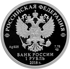 На лицевой стороне монет расположено рельефное изображение Государственного герба Российской Федерации, имеются надписи: "РОССИЙСКАЯ ФЕДЕРАЦИЯ", "БАНК РОССИИ", номинал монет - "1 РУБЛЬ", "3 РУБЛЯ", "25 РУБЛЕЙ" и "50 РУБЛЕЙ", дата - "2018 г.", обозначение металла по Периодической системе элементов Д.И. Менделеева, проба сплава для монет номиналом 1 рубль, 3 рубля и 25 рублей, проба для монеты номиналом 50 рублей, товарный знак Санкт-Петербургского монетного двора и масса драгоценного металла в чистоте.