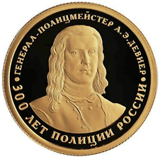 - монеты серии “300 лет полиции России” номиналом 50 рублей (каталожный № 5216-0115) -рельефное изображение портрета А.Э. Девиера; имеются надписи по окружности: вверху - “ГЕНЕРАЛ-ПОЛИЦМЕЙСТЕР А.Э. ДЕВИЕР”, внизу - “300 ЛЕТ ПОЛИЦИИ РОССИИ”.