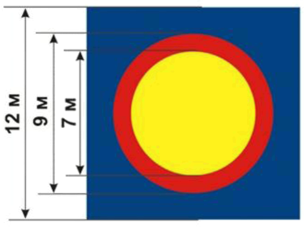 1. Ковер для борьбы на поясах должен быть размером 9 метров. Рабочая площадь ковра, на котором происходят схватки борцов, представляет собой круг диаметром 7 метров. Ширина зоны безопасности (остальной части ковра) должна быть не менее 2,5 метров в любой точке круга. Ковер, изготовленный из синтетического материала, должен быть гладким и иметь толщину не менее 5 сантиметров. Если ковер состоит из нескольких матов, то необходимо плотно их сдвинуть и прочно скрепить. В местах соединения не должно быть впадин и выступов. Центр ковра обозначается окружностью диаметром 1 метр, ширина линии границы, которой должна составлять 10 сантиметров. Граница ковра (его рабочей площади) должна быть четко обозначена линией (или зоной пассивности). Ширина линии границы ковра должна составлять не менее 10 сантиметров. Эта линия (или зона) входит в рабочую площадь ковра. Два противоположных угла ковра обозначаются зеленым и синим цветом (слева от судейского стола - зеленый, справа - синий).