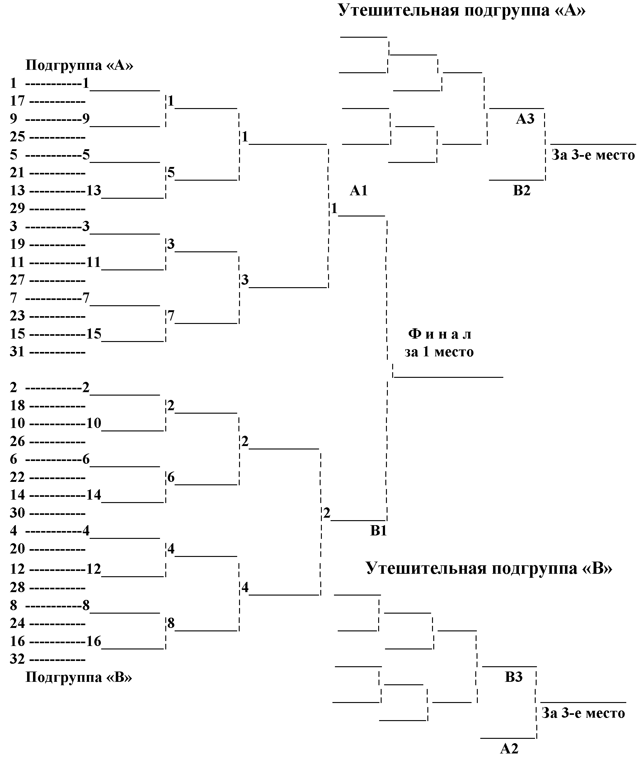 5. В Приложении 2.1, 3.1, 4.1, 5.1 даны примеры систем с различными вариантами способов проведения предварительной части и финала, а также способы проведения командных встреч, по результатам которых определяются места в командных соревнованиях.