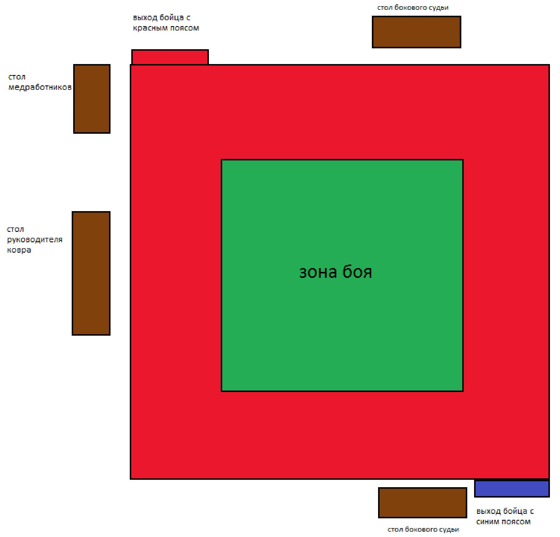 Ковёр находится на высоте 1 метр над уровнем пола в зале. Судьи и медработники располагаются на стульях за столами, установленными на полу, соответственно на 1 метр ниже уровня площадки.