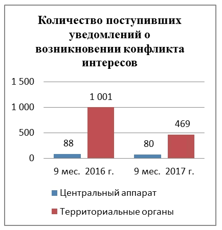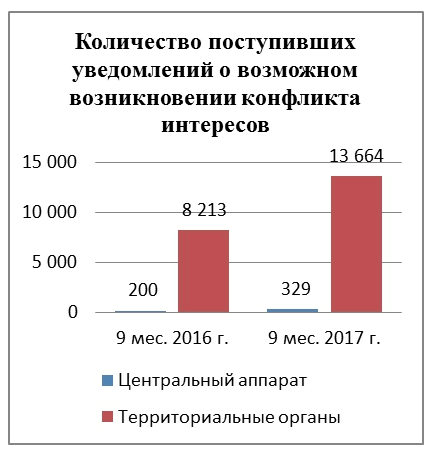Согласно данным мониторинга о ходе реализации мер по противодействию коррупции в государственных органах, организациях за 9 месяцев 2017 года поступило 13 993 уведомления должностных лиц о возможном возникновении у них конфликта интересов и 549 уведомлений о возникшем конфликте интересов.