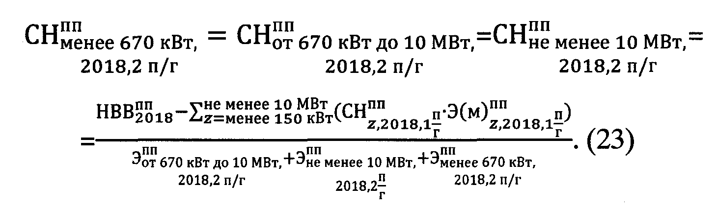 или в случае если не соблюдается условие непревышения сбытовой надбавкой ГП для подгруппы «менее 670 кВт» сбытовой надбавки ГП для подгруппы «не менее 10 МВт», рассчитанной по формуле (22) более, чем в 3 раза, то сбытовые надбавки для подгрупп “менее 670 кВт”, “от 670 кВт до 10 МВт” и “не менее 10 МВт" устанавливаются органами исполнительной власти субъектов Российской Федерации в области государственного регулирования тарифов на едином уровне и рассчитываются по формуле:»;