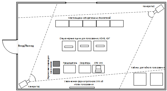 2.3. После определения мест размещения средств видеонаблюдения соответствующая УИК составляет схему размещения средств видеонаблюдения с учетом рекомендаций технического оператора (приложение N 1 к Порядку), обозначая на ней зону видимости каждой камеры видеонаблюдения и размещение технологического оборудования, столов и иного оборудования, а также место, с которого должен демонстрироваться протокол УИК об итогах голосования и оглашаться данные из него.