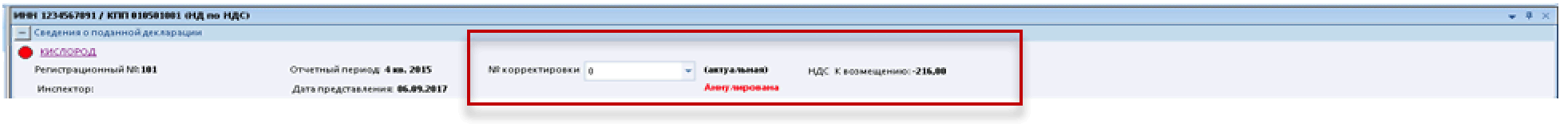 Если конкретная корректировка декларации по НДС была аннулирована, то для этой корректировки красным цветом выводится дополнительный признак "Аннулировано".