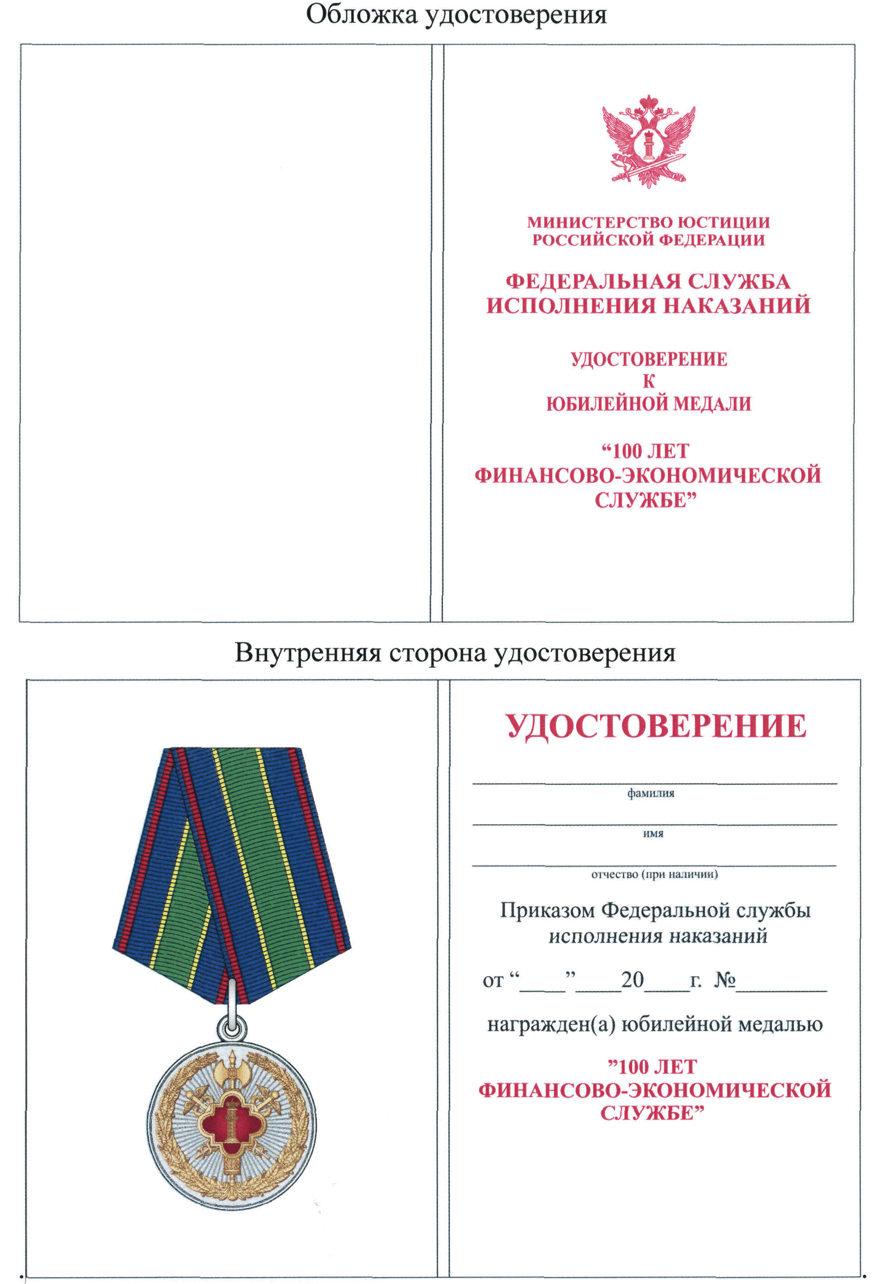 1. Юбилейная медаль "100 лет финансово-экономической службе" является ведомственной наградой Федеральной службы исполнения наказаний. Описание, рисунок юбилейной медали и рекомендуемый образец удостоверения к юбилейной медали "100 лет финансово-экономической службе" приведены в приложениях № 1 - 3 к настоящему Положению.