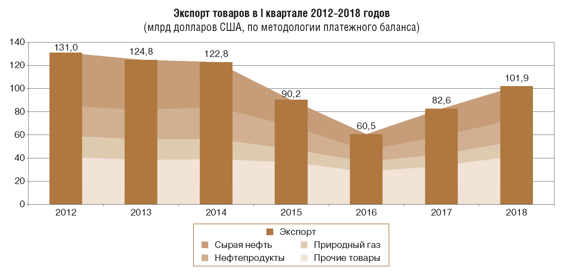 Экспорт товаров составил 101,9 млрд долл. США, что на 23,4% больше показателя соответствующего квартала предыдущего года (АППГ). В стоимостном выражении рост наблюдался практически по всем укрупненным товарным группам. Экспорт услуг составил 14,2 млрд долл. США, превысив на 1,9 млрд или на 15,1% показатель I квартала 2017 г.