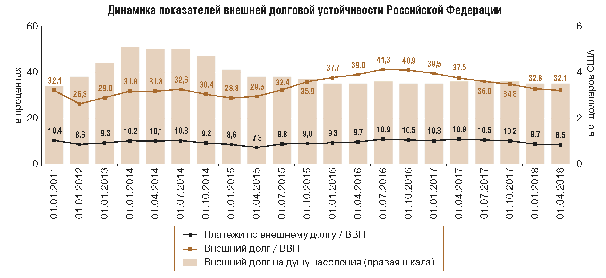 На 1 апреля 2018 года, согласно международным критериям, долговая нагрузка на российскую экономику была умеренной: отношение внешнего долга к ВВП уменьшилось до 32% (на начало 2018 года - 33%), а внешних долговых обязательств органов государственного управления к ВВП осталось стабильным - 4%.