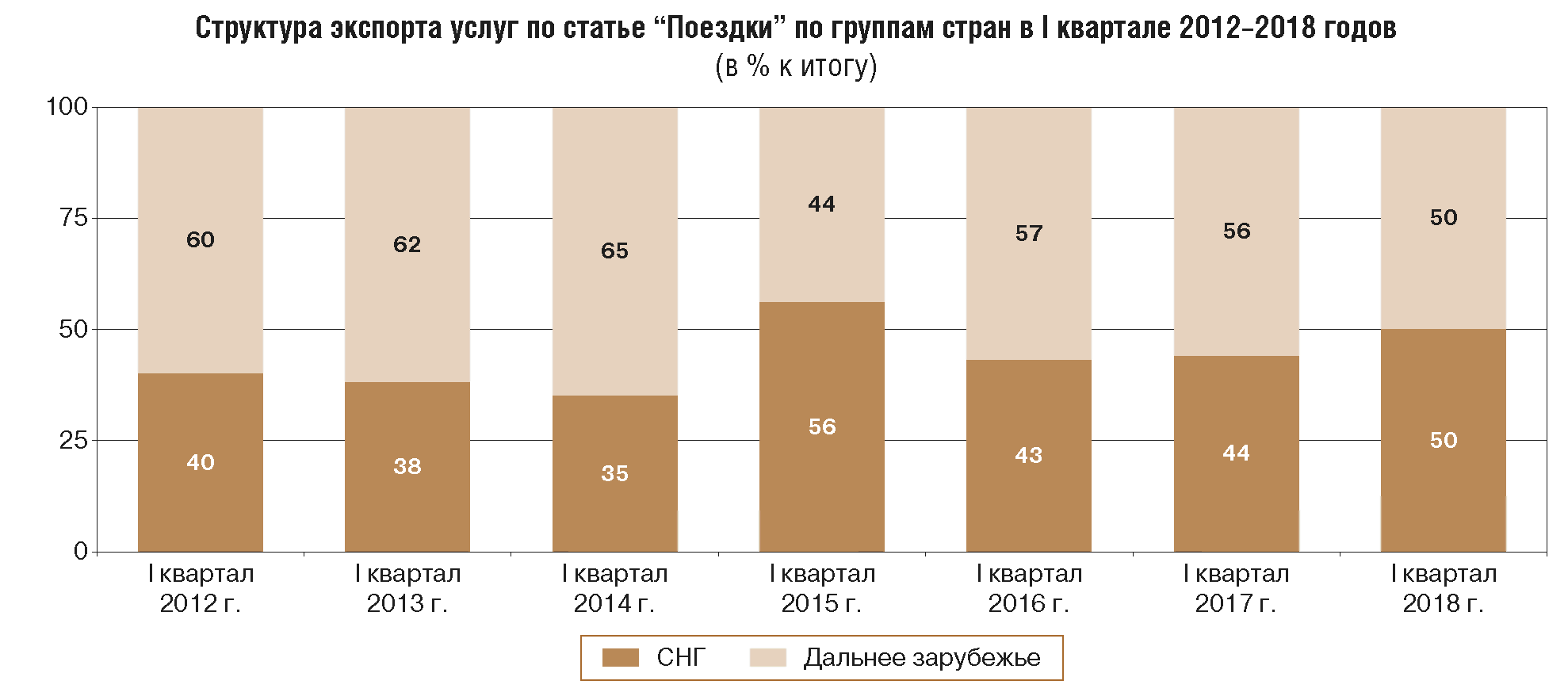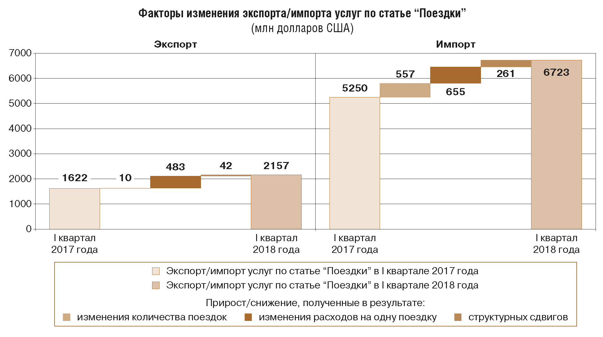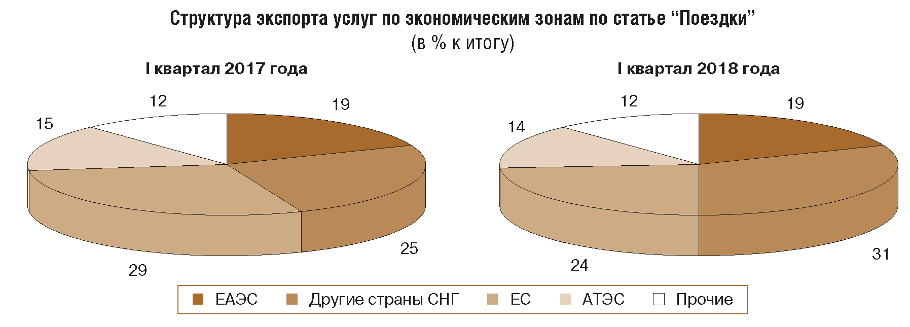 Экспорт услуг составил 14,2 млрд долларов США, превысив на 1,9 млрд долларов США, или на 15,1%, показатель I квартала 2017 года. Транспортных услуг нерезидентам оказано на 4,7 млрд долларов США, что на 0,5 млрд долларов США, или на 12,3%, больше показателя сопоставимого периода предыдущего года. Экспорт по статье “Поездки” равнялся 2,2 млрд долларов США (1,6 млрд долларов США годом ранее), динамика показателя связана как с ростом количества въездов иностранных граждан в Россию, так и с увеличением долларового эквивалента их расходов. Наиболее существенный прирост, на 0,8 млрд долларов США, до 7,3 млрд долларов США, наблюдался в сегменте прочих услуг, что объяснялось в том числе повышением спроса нерезидентов на работы в сфере строительства.