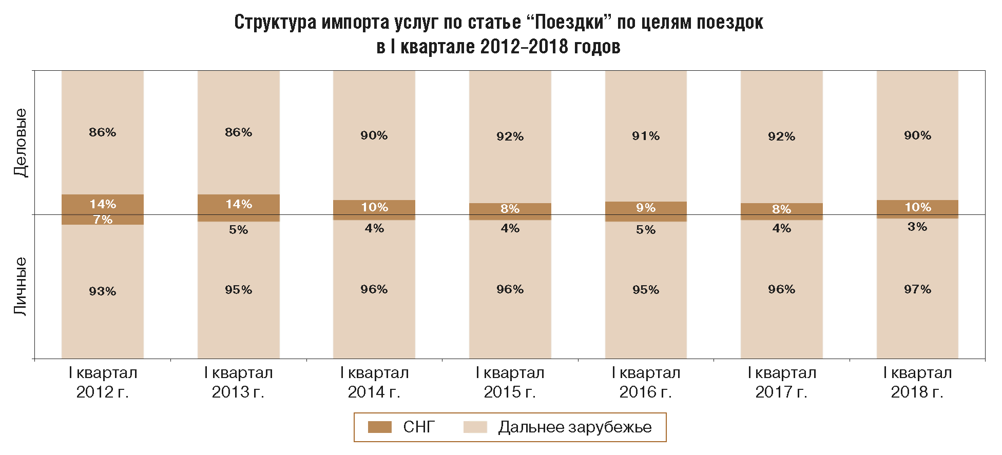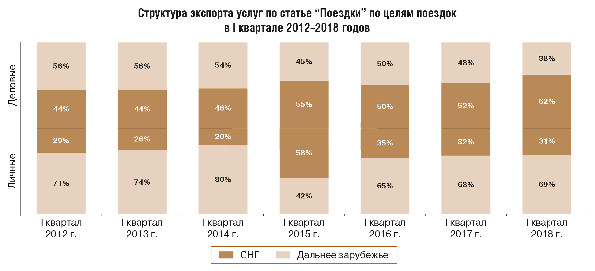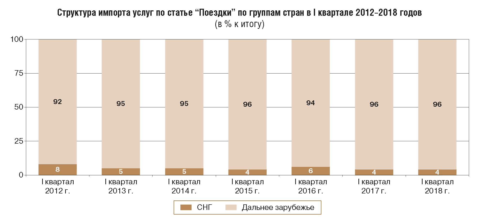 Экспорт услуг составил 14,2 млрд долларов США, превысив на 1,9 млрд долларов США, или на 15,1%, показатель I квартала 2017 года. Транспортных услуг нерезидентам оказано на 4,7 млрд долларов США, что на 0,5 млрд долларов США, или на 12,3%, больше показателя сопоставимого периода предыдущего года. Экспорт по статье “Поездки” равнялся 2,2 млрд долларов США (1,6 млрд долларов США годом ранее), динамика показателя связана как с ростом количества въездов иностранных граждан в Россию, так и с увеличением долларового эквивалента их расходов. Наиболее существенный прирост, на 0,8 млрд долларов США, до 7,3 млрд долларов США, наблюдался в сегменте прочих услуг, что объяснялось в том числе повышением спроса нерезидентов на работы в сфере строительства.