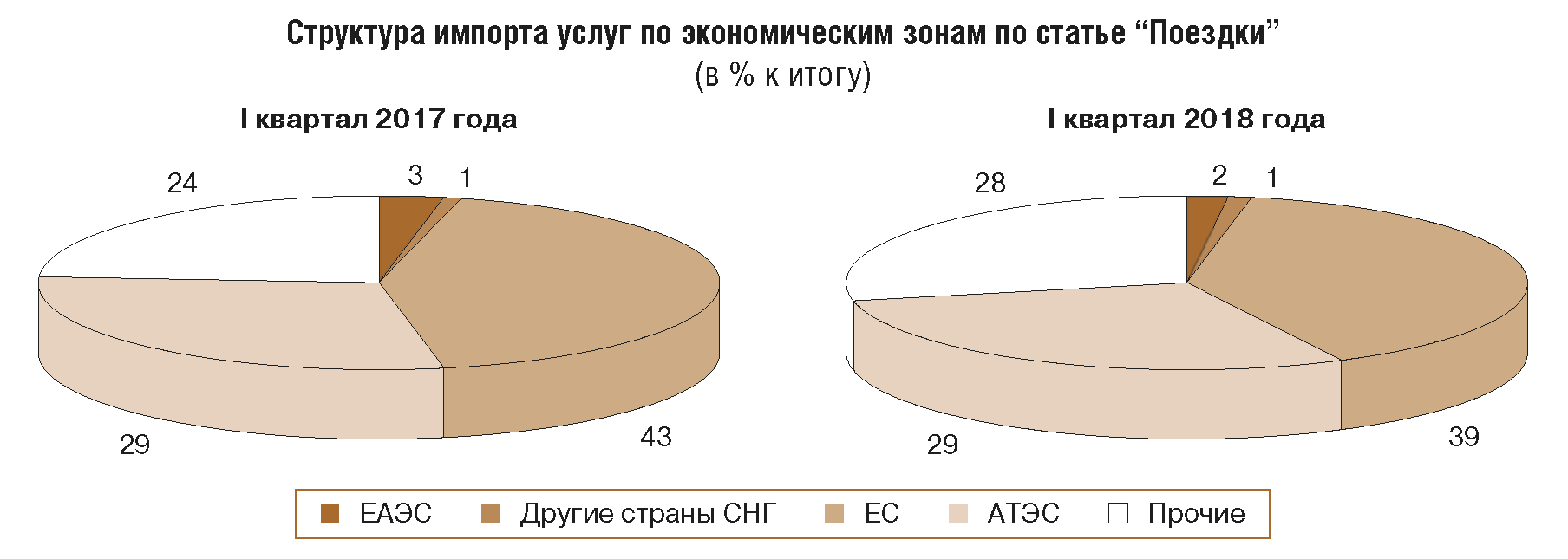 Импорт услуг увеличился до 20,8 млрд долларов США против 17,5 млрд долларов США в I квартале 2017 года в значительной степени в результате роста на 1,6 млрд долларов США, или на 30,3%, до 7,0 млрд долларов США потребления по статье “Поездки”. Импорт транспортных услуг стал больше на 0,4 млрд долларов США и составил 3,4 млрд долларов США. Прочих услуг оказано нерезидентами на 10,4 млрд долларов США, что на 1,2 млрд долларов США, или на 12,7%, превысило показатель годом ранее: наиболее значимым был спрос резидентов на услуги в сфере строительства, а также на использование интеллектуальной собственности.