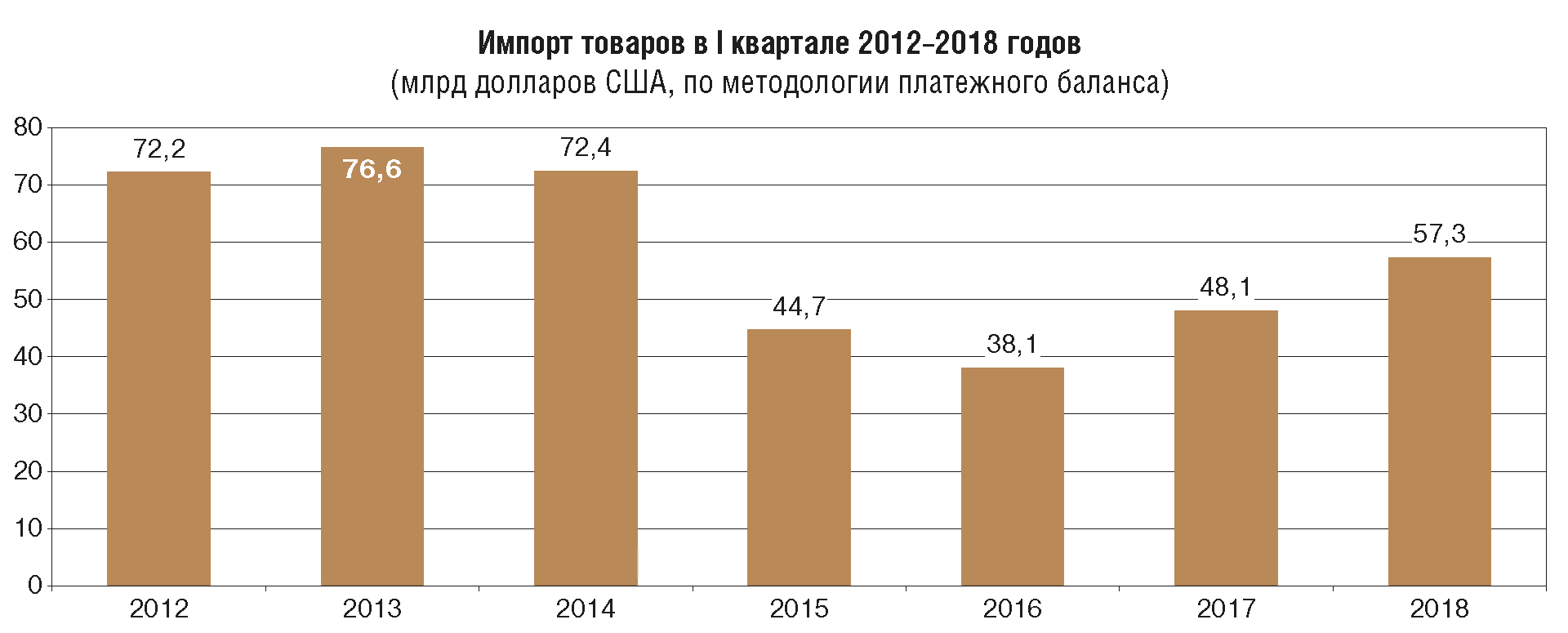 Наиболее значимой товарной группой в структуре импорта оставались машины, оборудование и транспортные средства, удельный вес которых составил 45,5% против 44,1% в сопоставимом периоде предыдущего года. Стоимостной показатель их ввоза в I квартале 2018 года преимущественно за счет поставок оборудования увеличился на 24,3%, до 24,9 млрд долларов США. Импорт продукции химической промышленности и связанных с ней отраслей вырос на 19,9%, до 10,3 млрд долларов США, доля группы - 18,8% - сохранилась на близком к прошлогоднему уровне. В то же время темп роста ввоза продовольственных товаров, включая сырье для их производства (11,6%), уступал среднему показателю, что обусловило снижение удельного веса группы на 0,9 процентного пункта, до 13,4%.