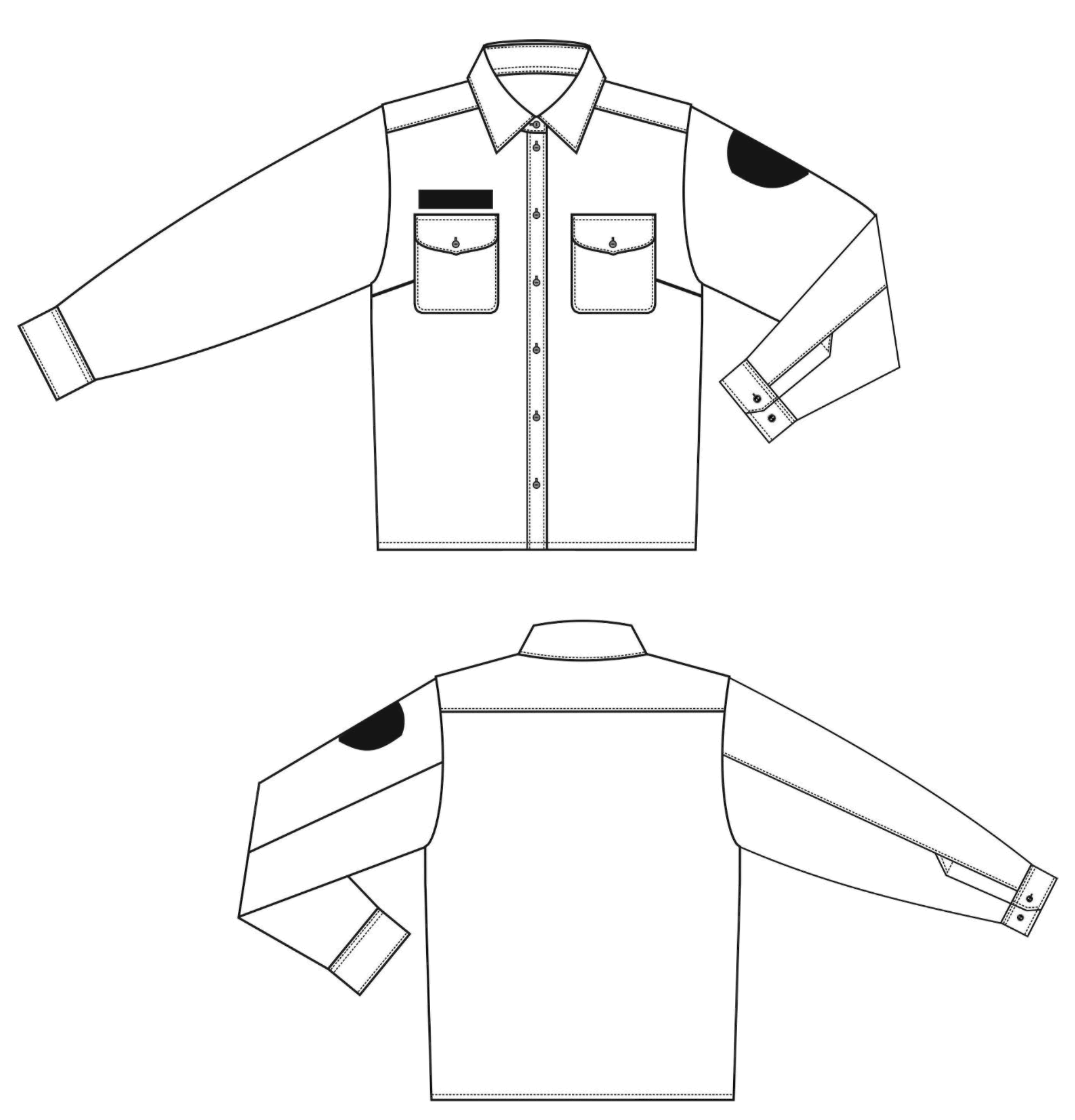 Полочки с накладными нагрудными карманами с клапанами фигурной формы, застегивающиеся на прорезную петлю и пуговицу. Карманы со скругленными углами. Над клапаном кармана правой полочки расположена контактная лента для пристегивания нагрудной нашивки.