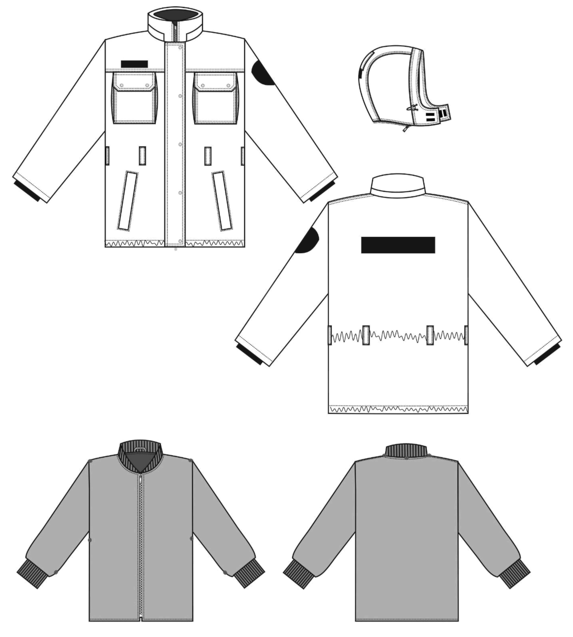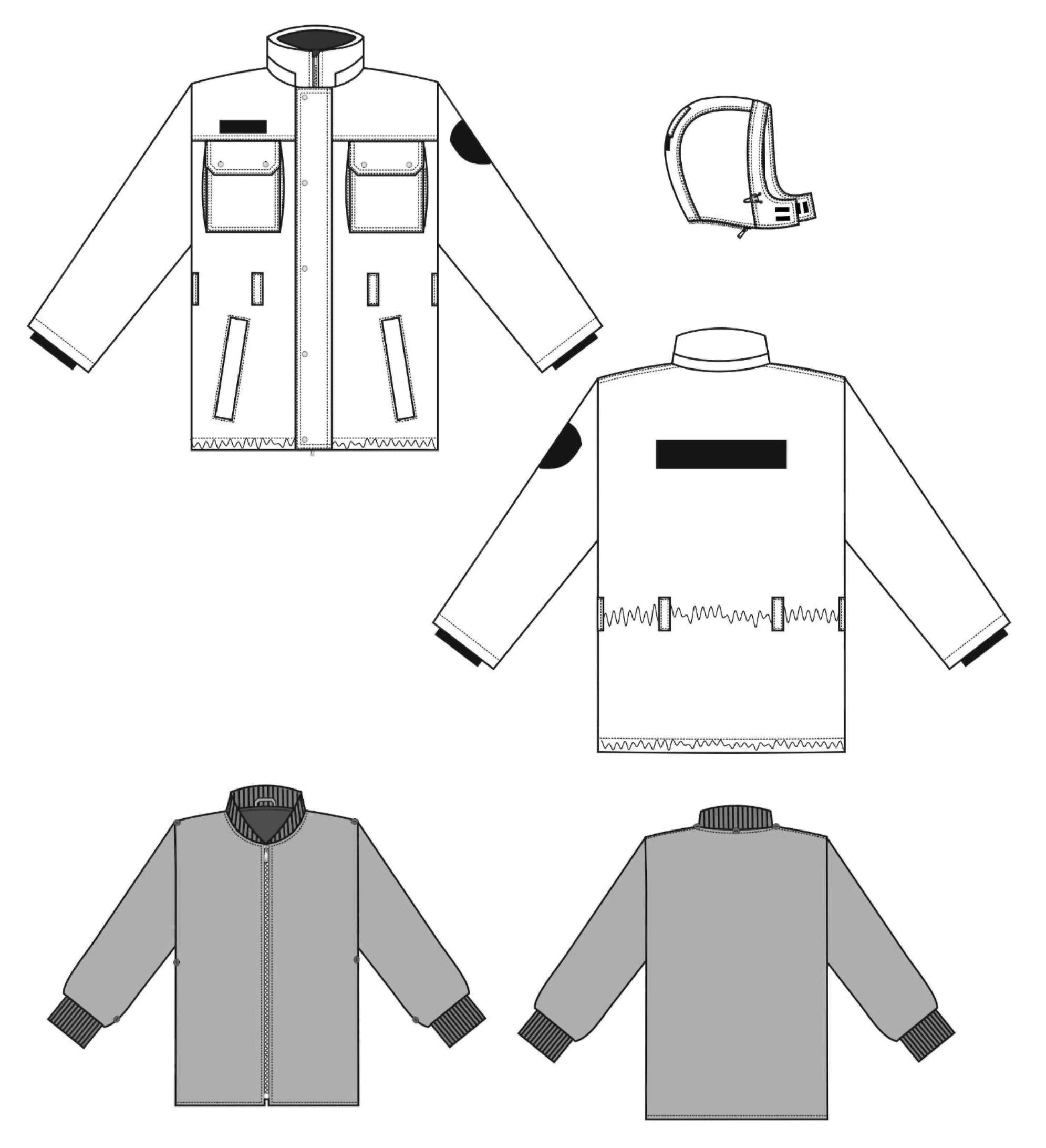 Съемный капюшон - утепленный, с подкладкой из флиса. Состоит из четырех частей: средней, двух боковых и притачной лицевой. Лицевая часть с расширенным подбородочным участком с текстильной застежкой. На средней части капюшона расположен хлястик с текстильной застежкой для регулирования объема. Длина лицевого выреза регулируется шнуром с фиксаторами с двойным входом, расположенным в кулиске. Капюшон пристегивается к куртке по горловине на тесьму "молнию", закрытую планкой. Теплозащитная подкладка куртки комбинированная: притачная и съемная.