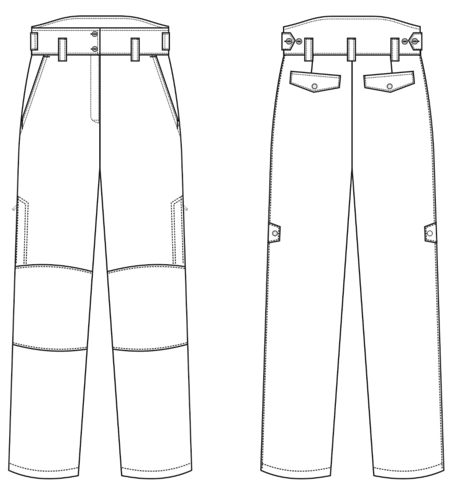 2.1.2. Брюки женские для защиты от общих производственных загрязнений и механических воздействий - с притачным поясом, пятью шлевками под широкий ремень, заутюженными стрелками на передних и задних половинках.