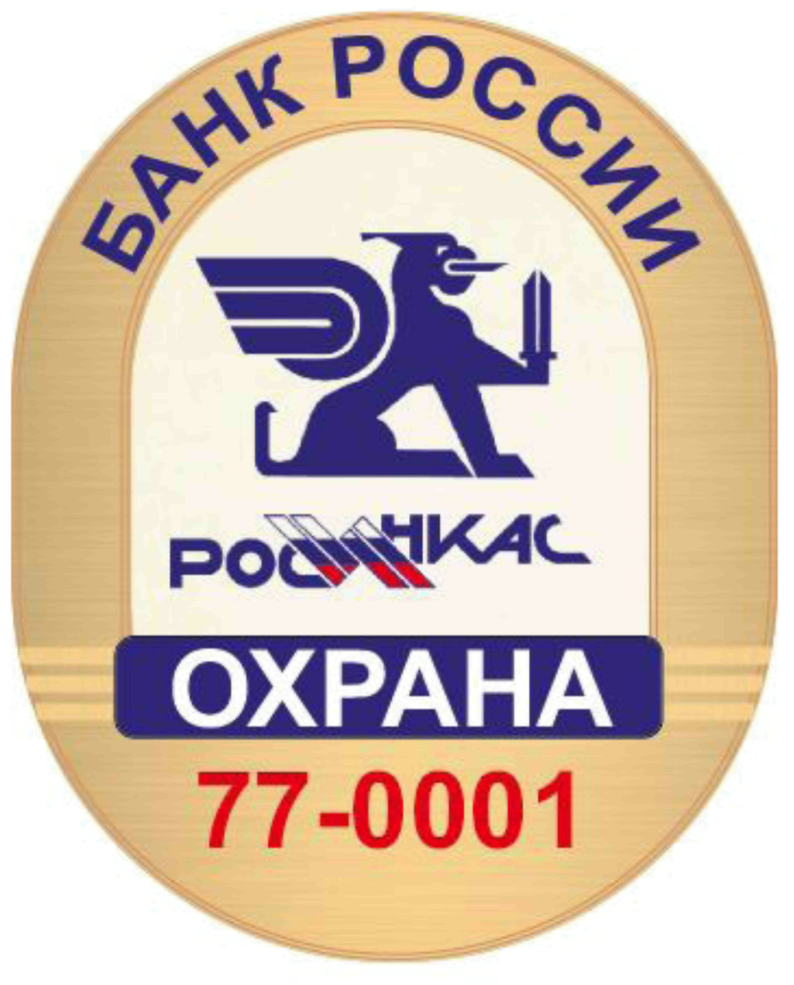 Основание нагрудного знака (жетона) имеет обрамление желто-золотистого цвета шириной 10 мм. В верхней части обрамления размещена надпись темно-синего цвета "БАНК РОССИИ". В центральной части нагрудного знака (жетона) на фоне с текстурой "газетная бумага" размещены логотип Объединения "РОСИНКАС" в виде крылатой рыси с мечом темно-синего цвета и стилизованная надпись "РОСИНКАС", в которой буква "И" выполнена в цветах Государственного флага Российской Федерации. Под надписью "РОСИНКАС" в прямоугольнике темно-синего цвета размером 43?08 мм размещена надпись "ОХРАНА", выполненная в белом цвете.