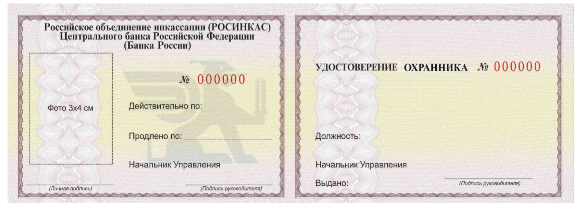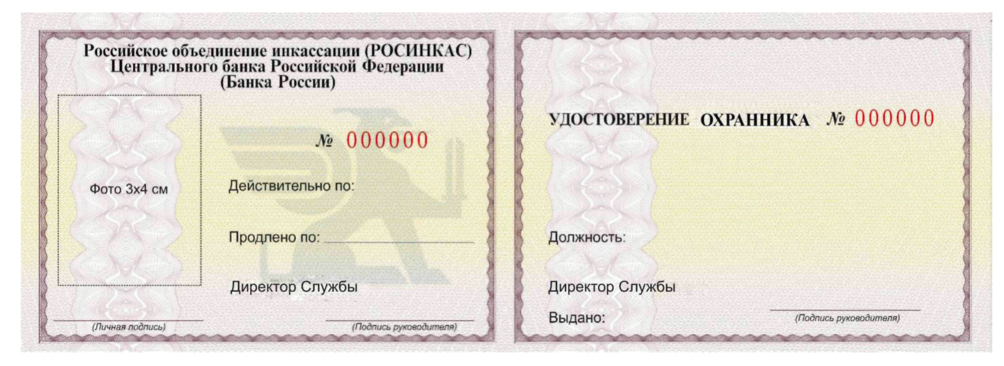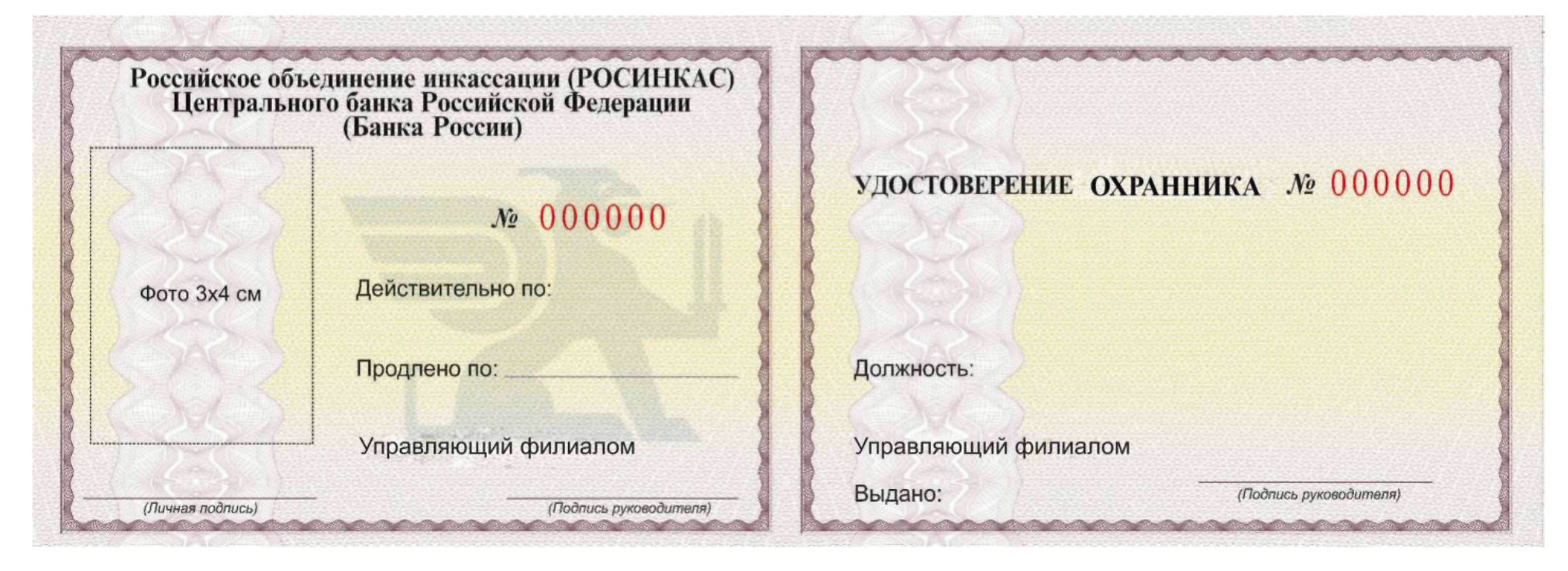 на расстоянии 8,5 мм от левого края - четыре надписи: ниже верхнего края на 21 мм - "УДОСТОВЕРЕНИЕ ОХРАННИКА N 000000", ниже этой надписи на 24,5 мм - "Должность:", еще ниже на 10 мм - наименование должности руководителя территориального управления инкассации - филиала Объединения "РОСИНКАС" ("Начальник Управления", "Управляющий филиалом", "Директор Службы") и еще ниже на 7 мм - "Выдано:";