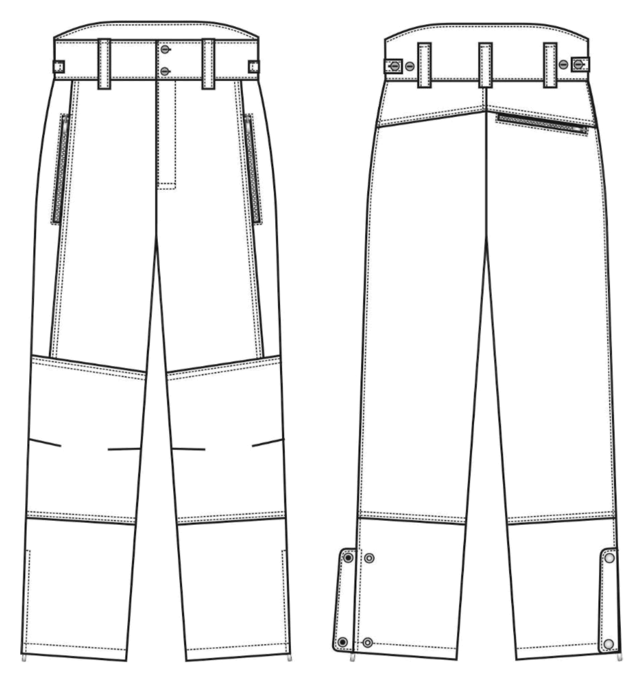 2.5.2. Брюки женские для защиты от пониженных температур (рисунок 15) - с притачной теплозащитной подкладкой, ветрозащитной прокладкой, притачным расширенным поясом, застегивающимся на две прорезные петли и пластмассовые пуговицы, с пятью шлевками для ремня по линии талии. В области боковых швов пояс регулируется по длине хлястиками с прорезной петлей и двумя пуговицами.