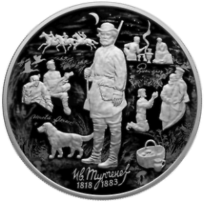 - монеты номиналом 25 рублей серии "200-летие со дня рождения И.С. Тургенева" (каталожный № 5115-0147) расположены рельефные изображения образов из сборника рассказов "Записки охотника" и в центре - героя-рассказчика, внизу имеются факсимиле подписи писателя и годы жизни "1818" и "1883".