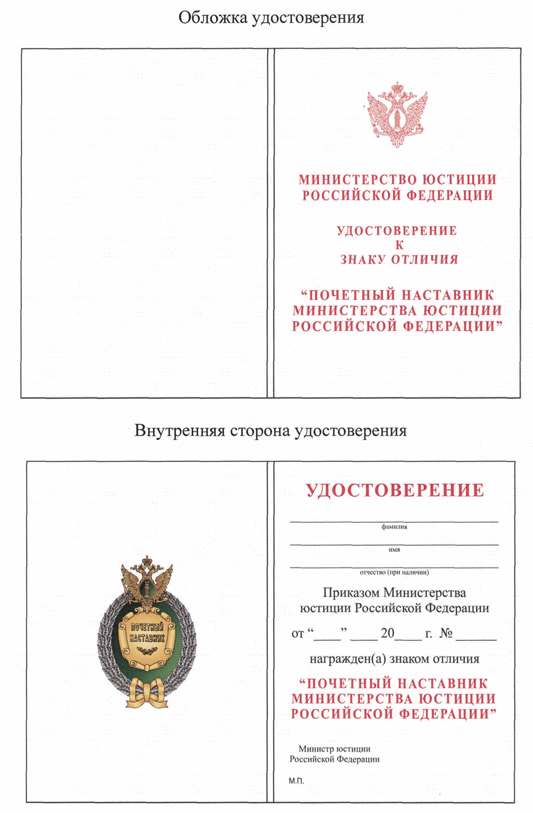 На первой странице бланка удостоверения располагается графическое изображение фигуры двуглавого орла с поднятыми вверх крыльями, увенчанного одной большой и двумя малыми коронами. Короны соединены лентой. На груди орла - фигурный щит. В поле щита - «столп Закона». В правой лапе орла - скипетр, в левой - держава. Под фигурой двуглавого орла располагаются надписи: «МИНИСТЕРСТВО ЮСТИЦИИ РОССИЙСКОЙ ФЕДЕРАЦИИ» - в две строки, «УДОСТОВЕРЕНИЕ К ЗНАКУ ОТЛИЧИЯ» - в три строки и «ПОЧЕТНЫЙ НАСТАВНИК МИНИСТЕРСТВА ЮСТИЦИИ РОССИЙСКОЙ ФЕДЕРАЦИИ» - в три строки. Фигура двуглавого орла и надписи отпечатаны красной краской.