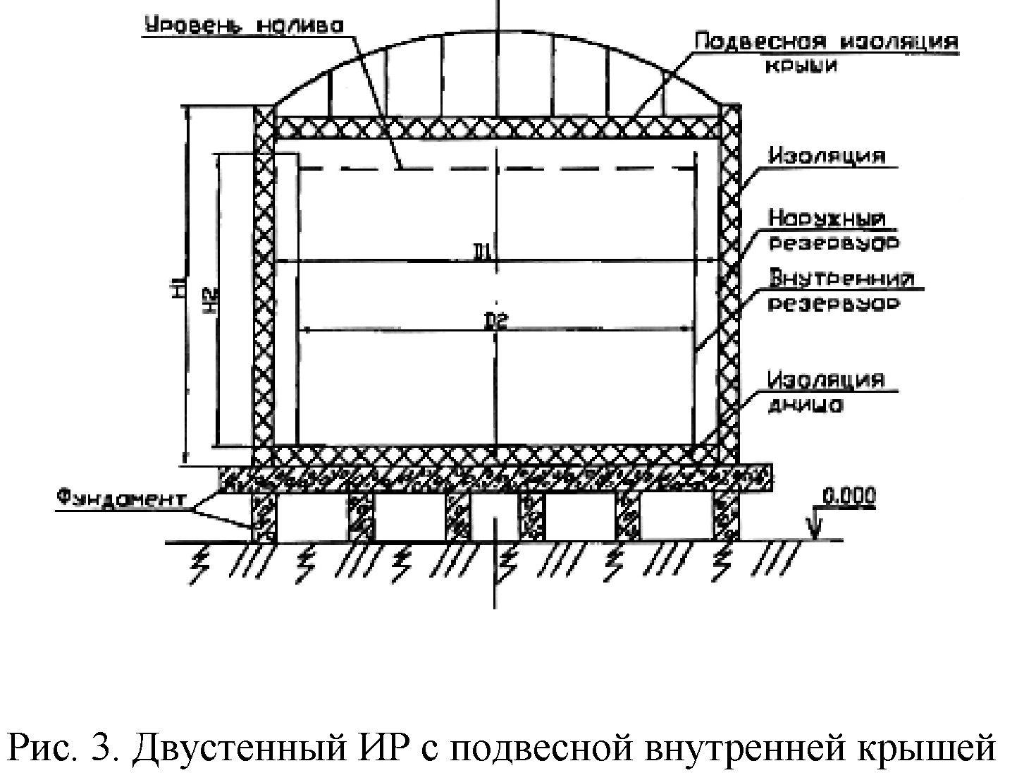 в) "полного сдерживания", имеющий два силовых корпуса, концентрически расположенных один в другом, каждый из которых предназначен для сдерживания гидростатического давления жидкости, причем наружный корпус герметичен и рассчитан на сдерживание давления газа; внутренний же корпус может быть как герметичным, то есть иметь собственную герметичную стационарную крышу, так и негерметичным и изготавливаться с паропроницаемой подвесной крышей, крепящейся на подвесках к крыше наружного резервуара;