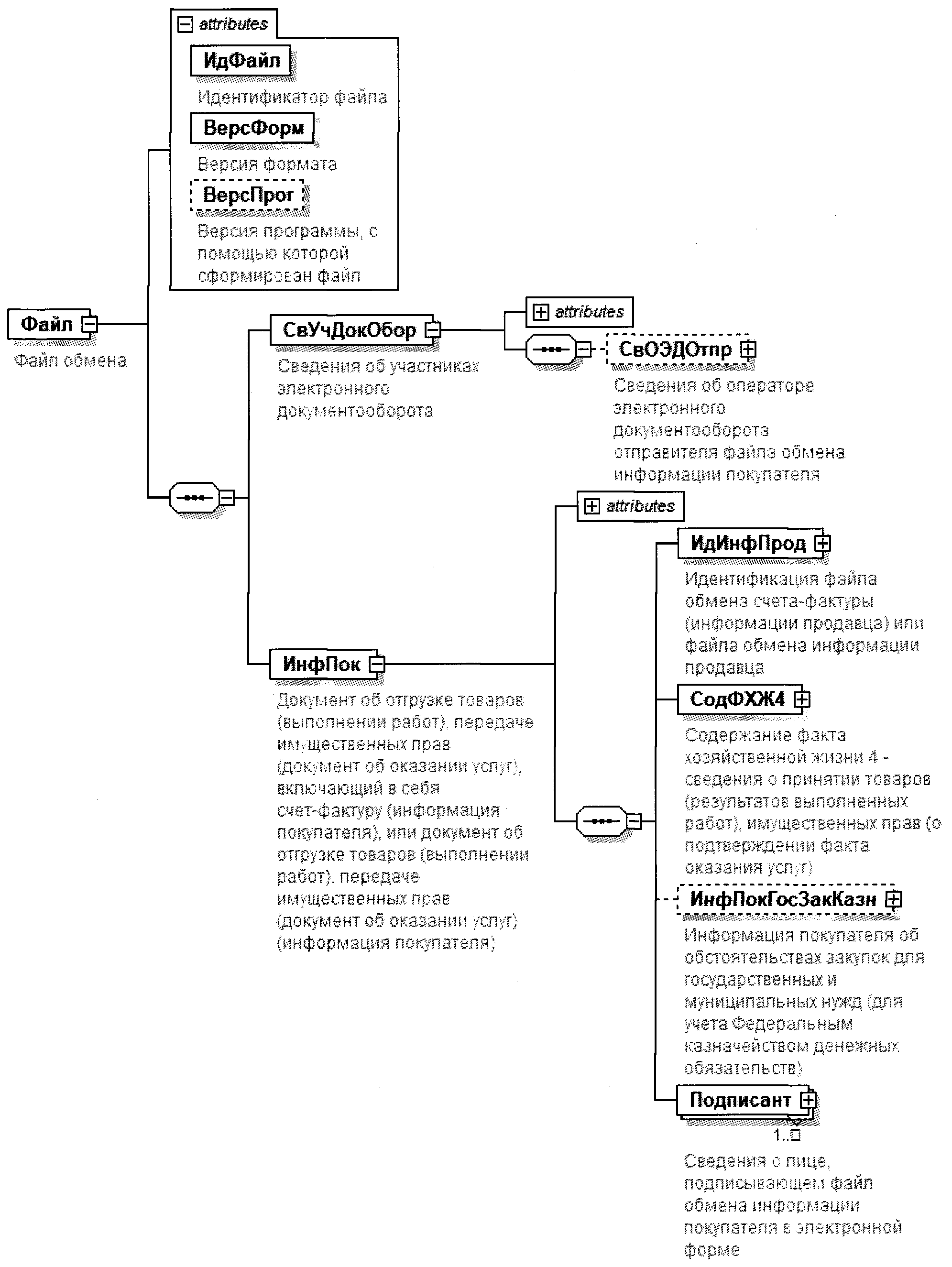 | Идентификатор файла обмена информации продавца | ИдФайлИнфПр | А | Т(1-255) | О | Содержит (повторяет) имя файла обмена счета-фактуры (информации продавца) или файла обмена информации продавца (без расширения) |