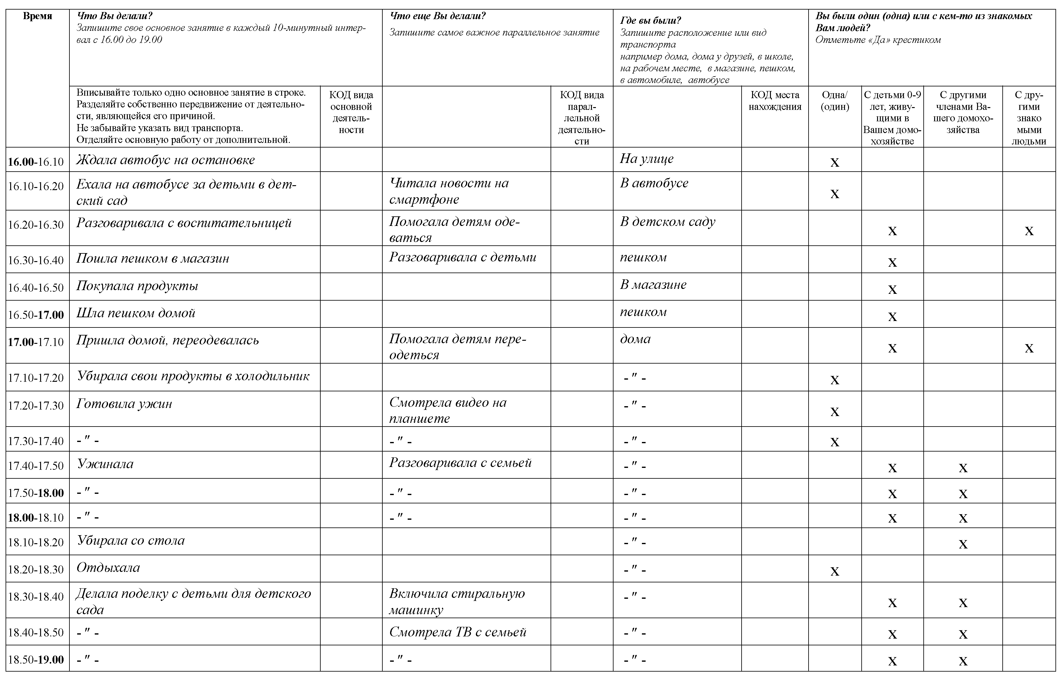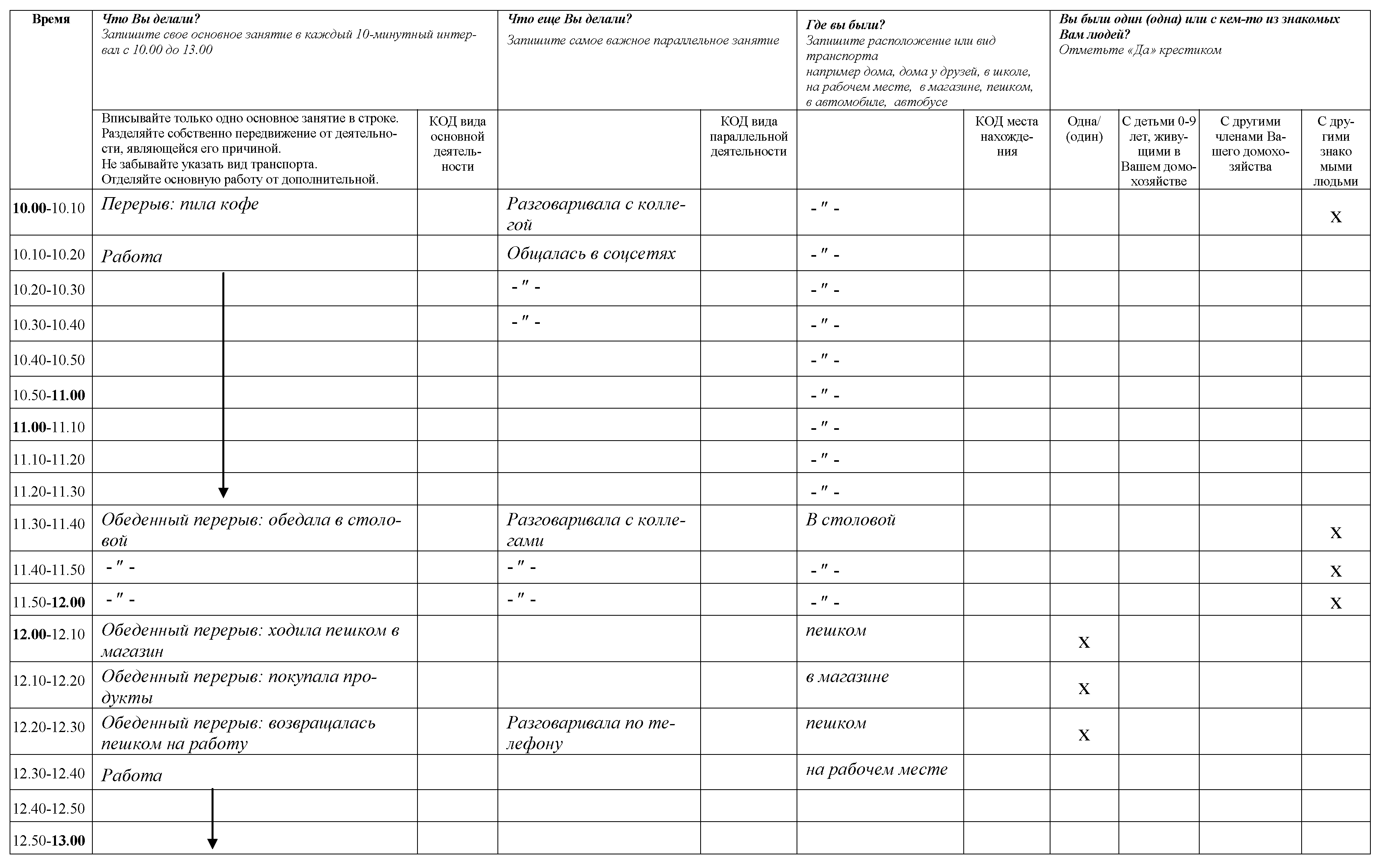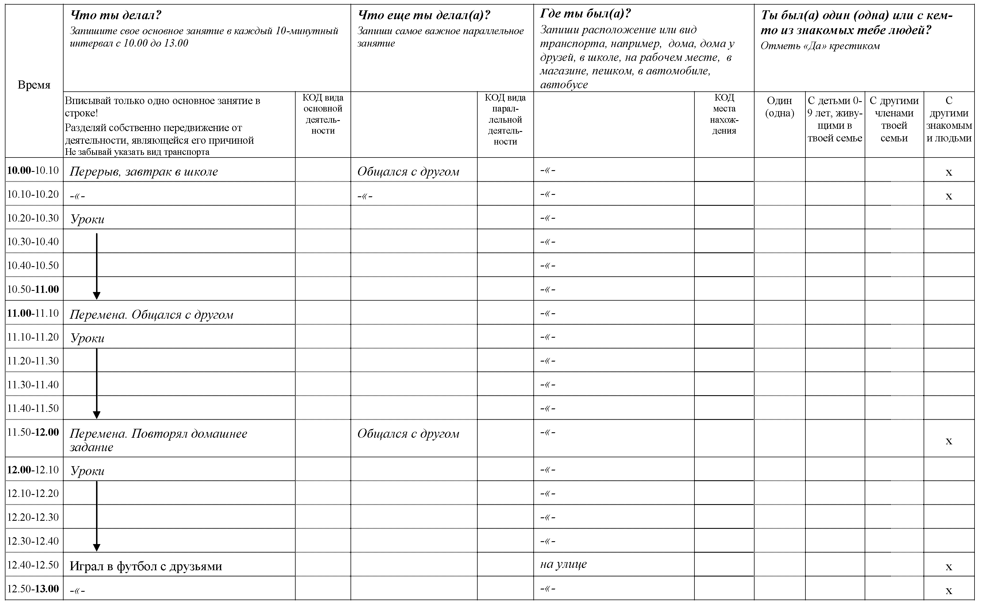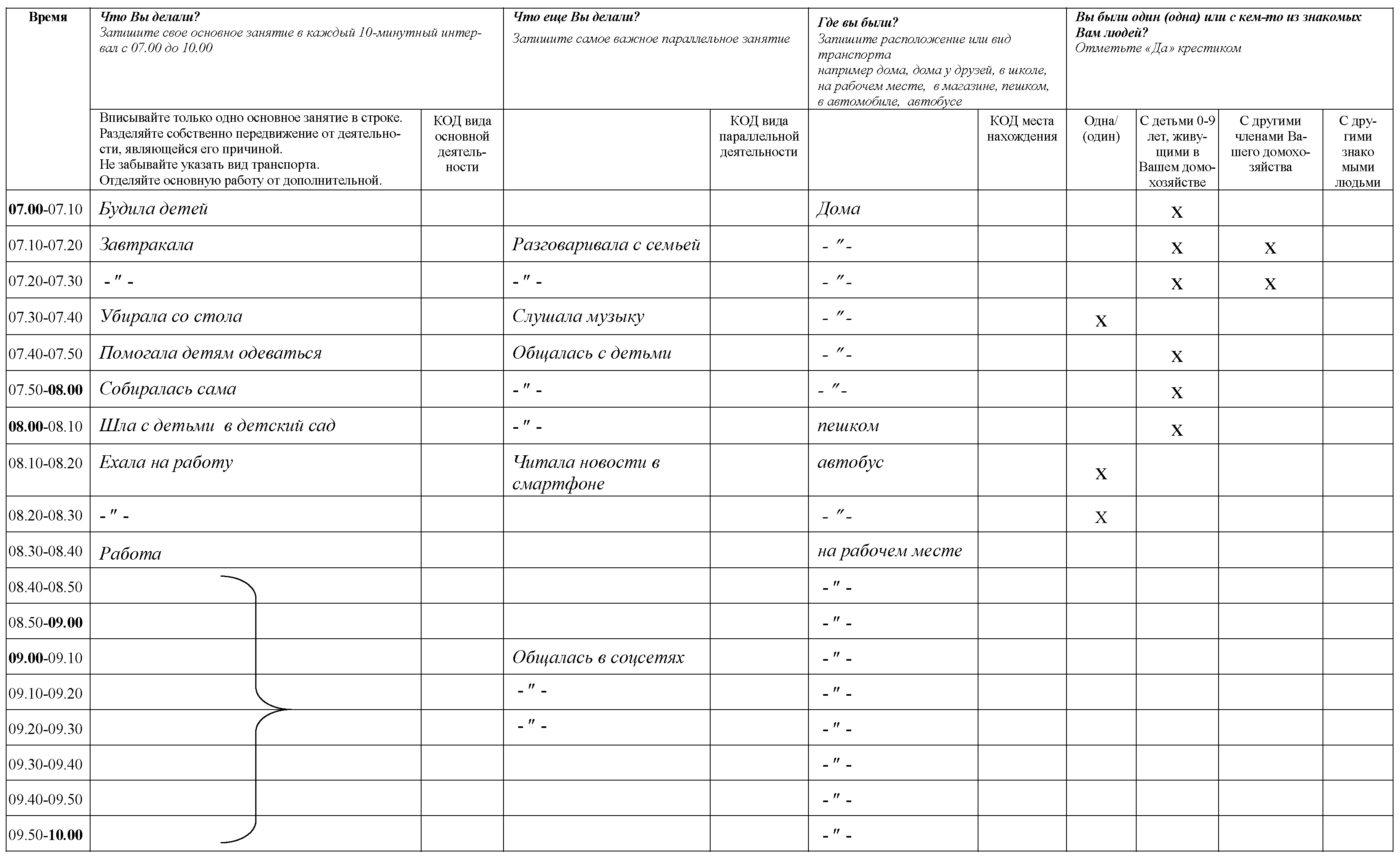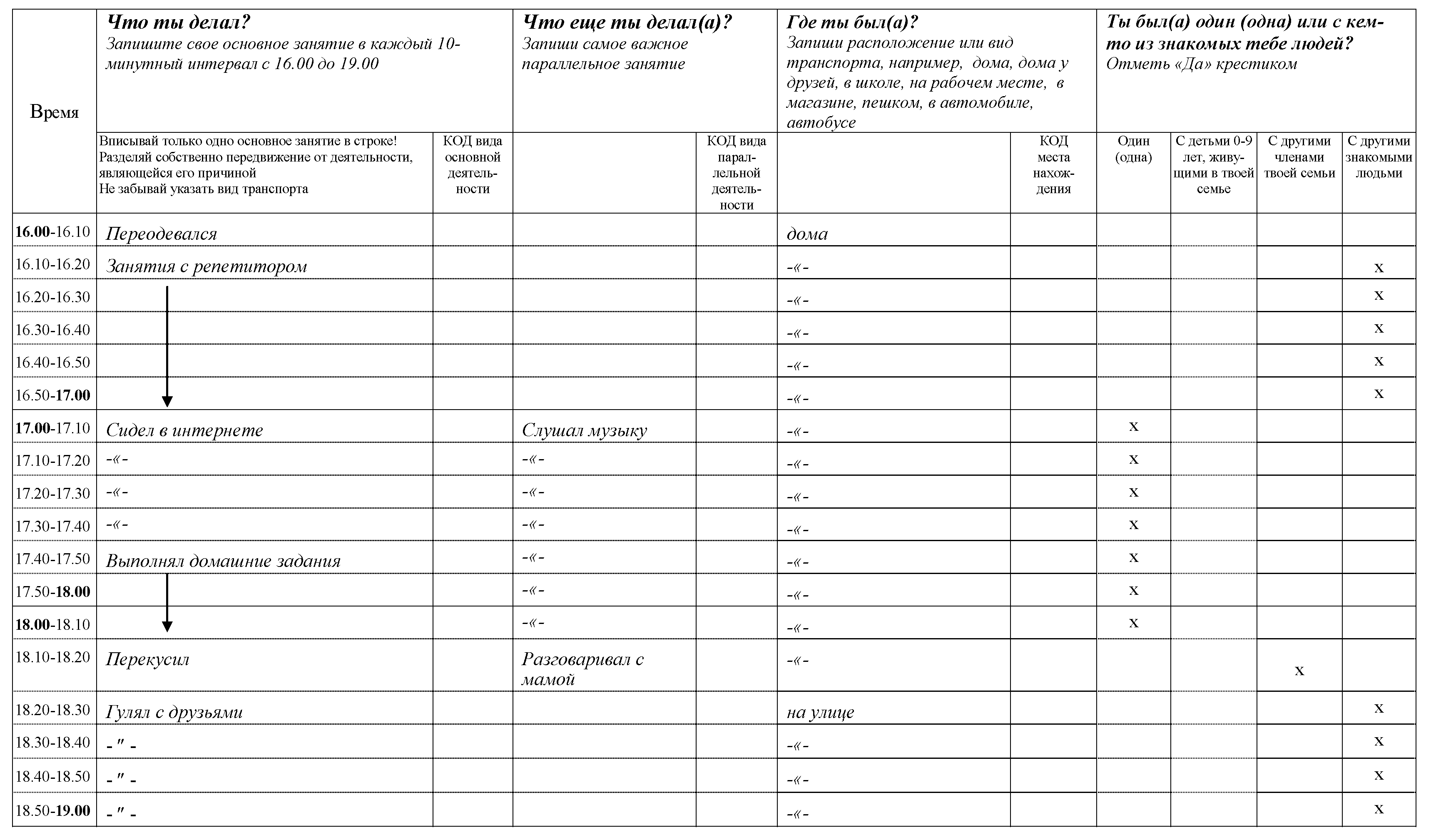 Не записывай более одного занятия в строке. Если ты в течение 10-минутного интервала совершил(а) более одного действия, запиши то, которое заняло больше всего времени. Если ты считаешь, что делал(а) что-то очень личное, напиши, пожалуйста, "личное".