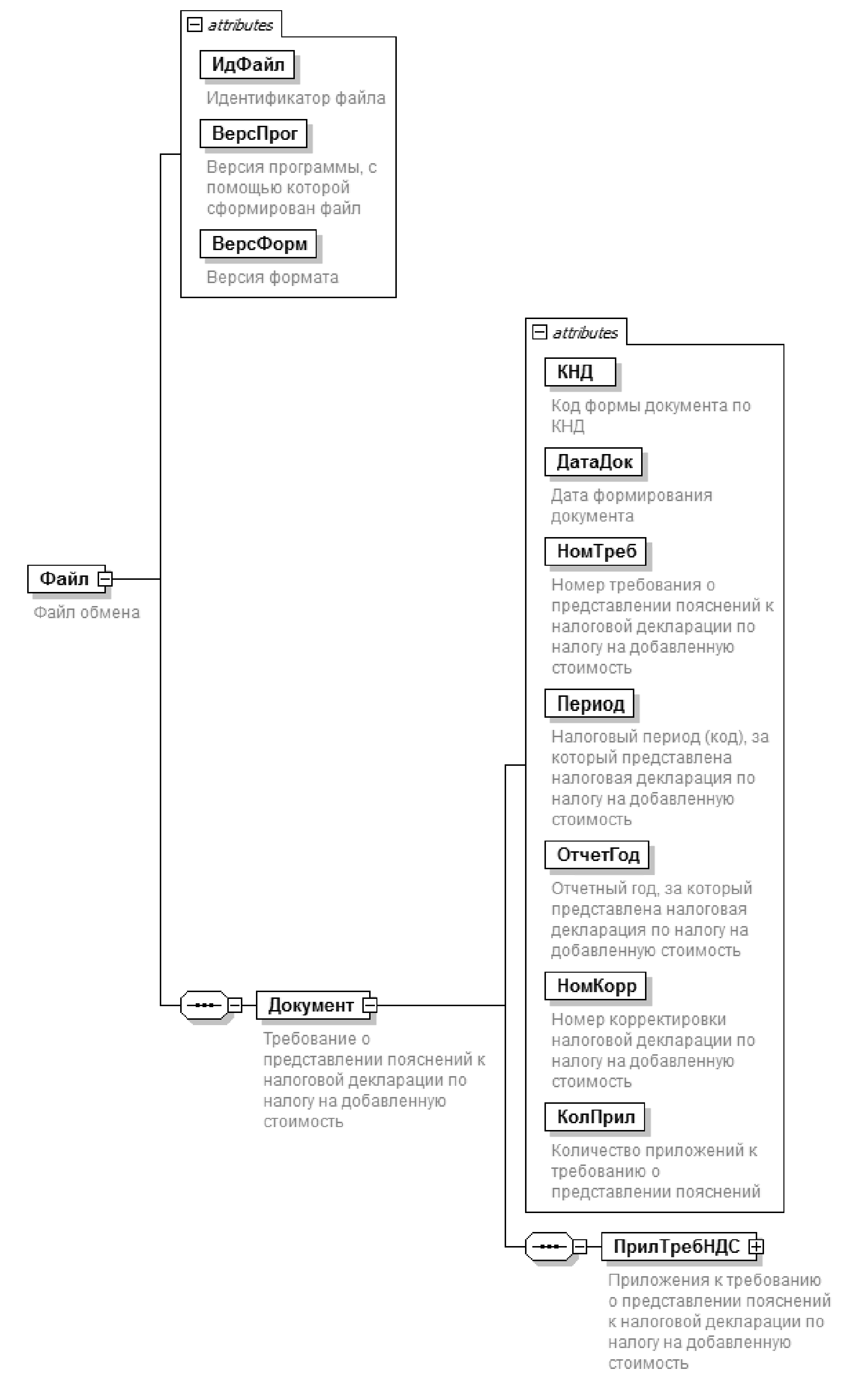 | Приложения к требованию о представлении пояснений к налоговой декларации по налогу на добавленную стоимость | ПрилТребНДС | С | О | Состав элемента представлен в таблице 4.3 |