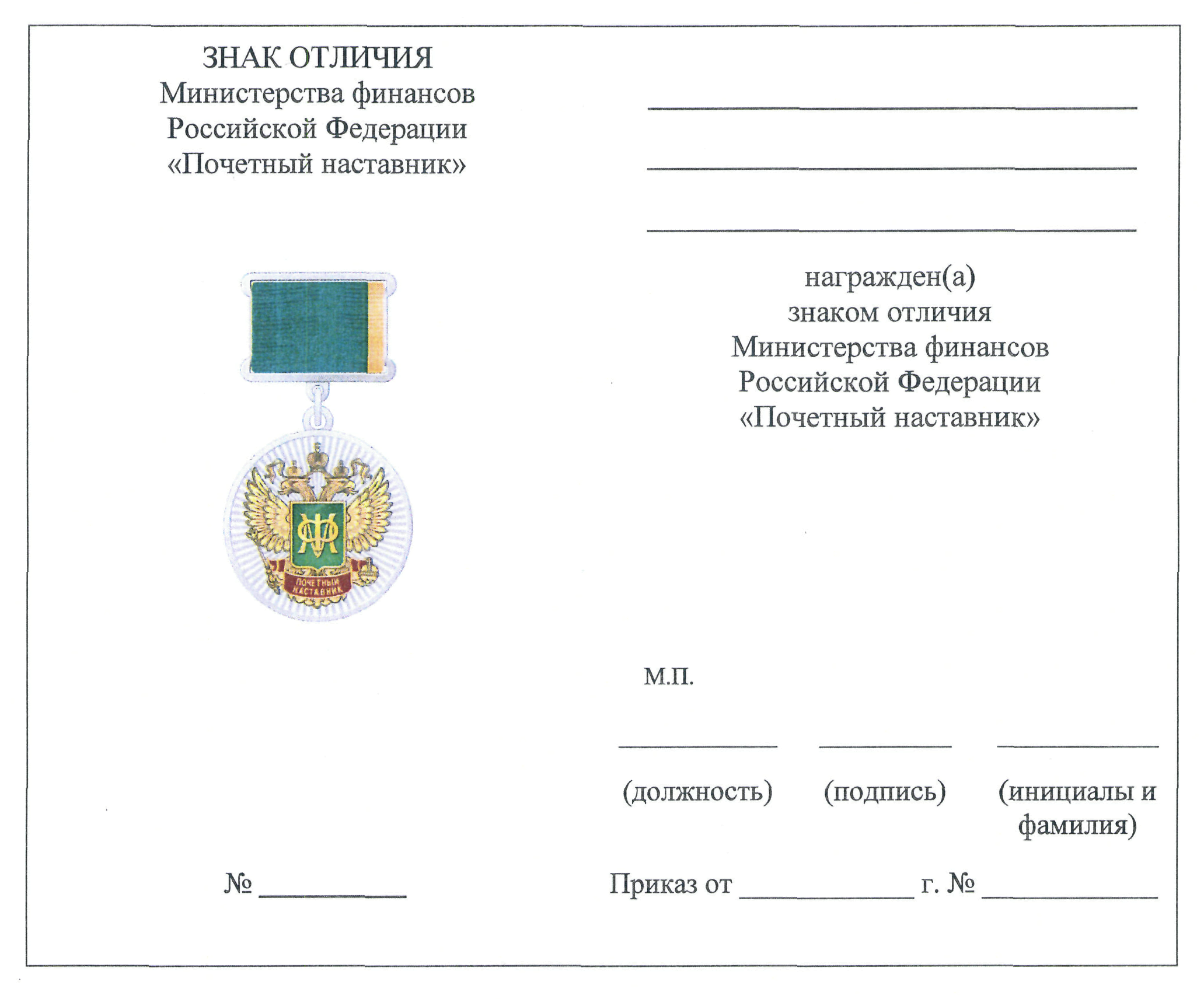 Минфин учредил знак отличия "Почетный наставник" и определил категории лиц, которым вручается знак, и порядок награждения. Утверждены описание и рисунок знака.
