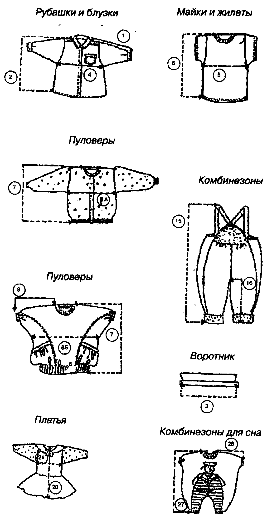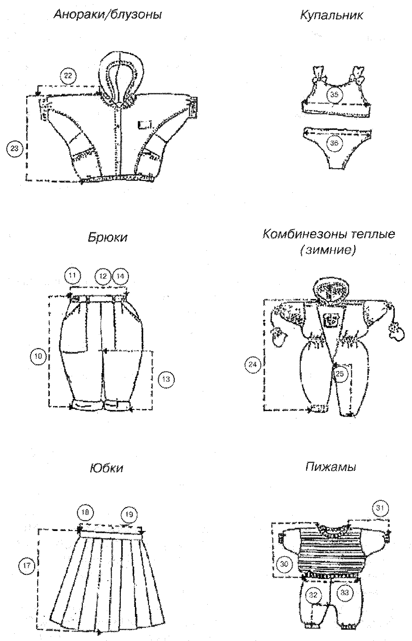 | Пижамы (из двух предметов) | 30 | шов втачивания воротника - низ верхнего предмета | 38 |