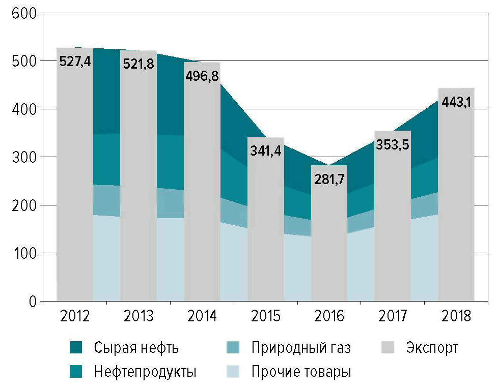 Экспорт товаров достиг 443,1 млрд долларов США, что на четверть выше показателя 2017 года. Увеличение стоимостных объемов поставок произошло преимущественно под влиянием ценового фактора: индекс-дефлятор экспорта составил 1,19, при этом опережающими темпами росли цены на основные топливно-энергетические товары (на 30,9%). Экспорт товаров в натуральном выражении увеличился на 4,9%, в значительной степени за счет неэнергетических товаров.