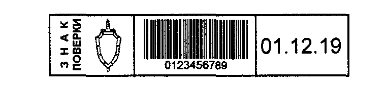 поле с надписью «ЗНАК ПОВЕРКИ» и изображением треугольного, вытянутого книзу щита с вырезанными верхними углами и меча за щитом, вертикально поставленного по оси симметрии острием вниз (данное поле наклейки изготавливается в виде голографического изображения);