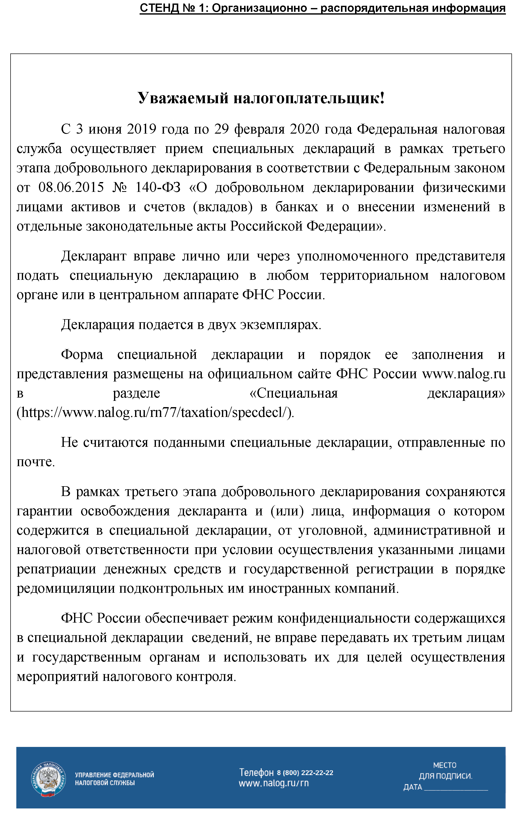 | 3 | Организация информирования плательщиков непосредственно в налоговых органах по месту учета о проведении третьего этапа декларирования в соответствии с Федеральным законом от 08.06.2015 № 140-ФЗ «О добровольном декларировании физическими лицами активов и счетов (вкладов) в банках и о внесении изменений в отдельные законодательные акты Российской Федерации» | Устное информирование. Размещение информации на стендах в помещениях территориальных налоговых органов | Не позднее 01.10.2019. Обновление по мере необходимости | Управления ФНС России по субъектам Российской Федерации | В соответствии с Федеральным законом от 08.06.2015 № 140-ФЗ |