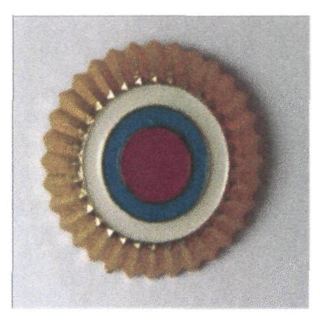 Кокарда представляет собой выпуклую золотистую розетку круглой формы с полированной гофрированной поверхностью и зубчатыми краями золотистого цвета. По окружности полоски выложены белой, голубой и красной эмалью. Диаметр кокарды - 30 мм.