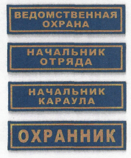 Нагрудные нашивки изготавливаются из плотной ткани синего цвета и имеют форму прямоугольника с желтой окантовкой размером 12x3 см. В середине надпись «ВЕДОМСТВЕННАЯ ОХРАНА» или наименование занимаемой должности желтого цвета.