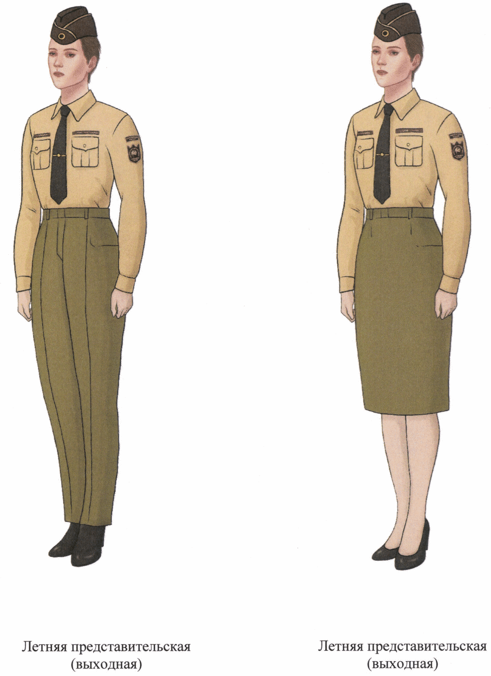летняя - пилотка коричневого цвета или берет коричневого цвета, костюм женский "представительский" (пиджак, юбка или брюки), блузка женская "представительская" бежевого цвета, галстук или галстук-бант черного цвета, пиджак коричневого цвета, туфли или полусапоги демисезонные черного цвета;
