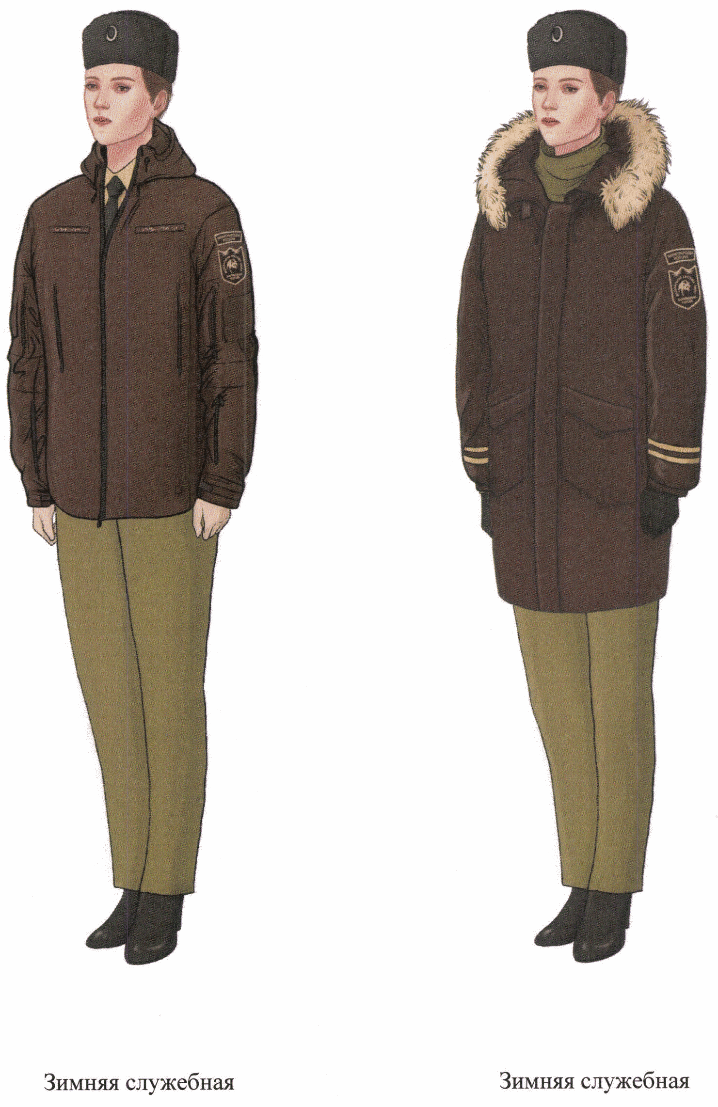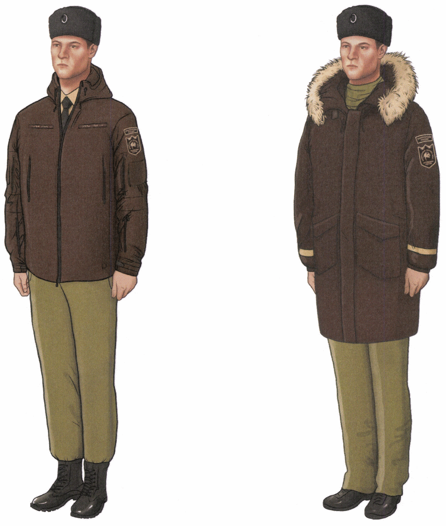 зимняя - шапка-ушанка меховая черного цвета, куртка зимняя пуховая (парка) коричневого цвета с капюшоном, брюки "служебные" светло-зеленого цвета, куртка "служебная" из флисовой ткани коричневого цвета с капюшоном, рубашка бежевого цвета с длинным рукавом (с возможностью регулировки), галстук черного цвета, перчатки черного цвета, шарф светло-зеленого цвета, сапоги зимние или ботинки с высокими берцами.